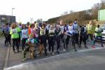 Und dann ging es auch schon los! Für die Kleinen auf die Ein-Kilometer-Runde durch den Ort, für die Großen in Richtung Autobahnbrücke. Am Ende des Läuferfeldes reihte sich auch Paula mit ihrem Frauchen ein. Ein Stückchen wollten sie nur mitgehen, wenn Frauchen nicht mehr kann, geht’s wieder zurück. Derweil waren die Läufer auf der Brücke angekommen und natürlich gingen freundliche Grüße an alle winkenden Autobahnfahrer. Bald waren 2,5 Kilometer absolviert und der Wendepunkt erreicht: „Auf der Stelle hopsen, das macht wieder warm!“, versuchten die Sportler den festgefrorenen Streckenposten wieder einzuheizen.