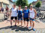 Es waren immer noch Athleten der Halbdistanz auf der Laufstecke, als es dann auch endlich für die aufgeregten Bode-Runners losging. Im Vorfeld gab es heiße Diskussionen über das zugelassene Equipment bei den Disziplinen. Da wurde dann schon mal das Regelwerk der Deutschen Triathlon Union in ihrer aktuellen Wettkampffassung heruntergeladen und interpretiert. Schnorchel und Schwimmschuhe durften demnach nicht mit, stattdessen mussten irgendwie noch diese Rohrenden am Lenker verschlossen werden! Geschafft, alle sechs Räder der Gaensefurther bestanden den Check-in und durften im großen Wechselgarten, mitten auf dem Marktplatz von Arendsee, Platz nehmen. Nun ging es mit dem Schaufelraddampfer „Queen Arendsee“ hinaus auf den aalglatten See. Der Puls schlug bis zum Hals, denn als die Queen stoppte, mussten über 150 Jedermänner möglichst schnell den Sprung vom Dampfer in das kalte Wasser wagen. Eine gelbe Boje markierte die Wasserstartlinie, schnell nochmal das Ziel am Ufer anvisiert, bevor von der Queen Arendsee lautstark das Startsignal ertönte. Als Brustschwimmer hatte man alles gut im Blick, viele versuchten sich auch im Kraulstil, keine Rede mehr von einem aalglatten See. Stefan Sindermann berichtete sogar von Rückenschwimmeinlagen, Hauptsache sich mit dieser unbeliebten und ungewöhnlichen Betätigung an das Ufer retten! Von den zahlreichen Zuschauern wurden die pudelnassen Schwimmer mit Applaus begrüßt. Der war auch dringend nötig, ging es doch an der Kaskade ziemlich krass den Berg hoch, über die Amtsfreiheit und Hohe Warthe zur Friedensstraße, einen halben Kilometer bis zum Wechselgarten auf dem Marktplatz. Gut, wer sich den Standort seines Rennrades vorher eingeprägt hatte. Schuhe an, Helm auf und ab auf die zwei Runden vom Marktplatz, über die Feld- und Bahnhofsstraße, zur B 190 nach Leppin. Hier lieferte sich Heike Lenz mehrfach ein Kopf-an-Kopf-Rennen mit dem starken Geschlecht. Da auch beim Radfahren strenge Regeln gelten und sich die Eingeholte immer wieder zurückfallen lassen musste, um Zeitstrafen wegen Windschattenfahrens zu vermeiden, folgte Antritt um Antritt, bis sich die Konkurrenten endlich geschlagen gaben. Die Debütanten Wuwer und Bothe ließen beim Schwimmen und auf der Radstrecke viele Körner. „Nie wieder!“, taten sich Gedanken auf, während Peter Brauer, Heike Lenz und Stefan Sindermann auf den abschließenden fünf Kilometern noch einige Jedermänner einkassieren konnten. Zwei Stunden Sportspaß sollten vergehen, bis alle Bode-Runners im Ziel wieder vereint waren. „Was für ein geiler Scheiß!“, waren sich alle einig und feierten den verdienten ersten Platz von Heike Lenz in der Wertungsklasse Seniorinnen 4. Vielleicht genug Ansporn um in die altmark3cup-Wertung der Jedermänner zu kommen und die Wettkämpfe in Wischer (09.07.2023) und Havelberg (03.06.2023) anzuschließen. Für einige Bode-Runners wird auf jeden Fall der vereinsinterne 5. Salzlandsparkassen-Triathlon am 26.08.2023 rund um den Löderburger See ein Pflichtprogramm sein.