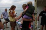 In der langen Warteschlange zur Abholung der Startunterlagen ging der Blick oft nach oben. Dicke Regenwolken thronten am Himmel und entleerten sich immer wieder in kleinen Huschen über den Arendsee. Die Teilnehmer der olympischen Distanz hatten den Kampf mit den Elementen aus dem Vorjahr noch gut in Erinnerung. Haarscharf entkamen sie damals dem tobenden See, was für einige bereits nach der Schwimmdistanz das unwiderrufliche Aus bedeutete. So bestand der Veranstalter in diesem Jahr auch wieder auf die Badekappenpflicht. Nur mit diesem auffallenden Utensil ausgestattet, war der Zutritt zum Schaufelraddampfer „Queen Arendsee“ freigegeben. Promi Antje Buschschulte begleitete als Zuschauerin und zum Daumen drücken ihren Ehemann Helge Meeuw auf der „Queen“. Während der Fahrt zum Start, lauschten die Teilnehmer angespannt den letzten Hinweisen der Wettkampfleitung. Dann ging alles ganz schnell.