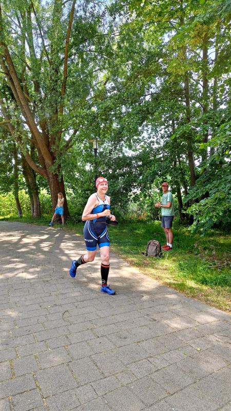 Nach weiteren 7 bis 9 Minuten Minuten erreichten die ersten Damen der Gaensefurther Triathleten das Ziel. Annegret Wille wurde immer wieder auf der Laufstrecke von Ina Schöler überholt. Auch der letzten der vier Schwimmstrecken hatte aber erneut Wille die Nase vorn und erreichte das Ziel in 1:46h (Platz 18). Ina Schöler folgte in 1:48h (Platz 20). Mit erfrischenden Erdbeerspießen und Erfrischungen wurde Silke Ludßuweit empfangen sie beendete den Wettkampf nach 2:12h (Platz 37).