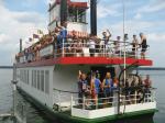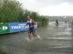 Nun waren auch die Deutschen Polizeimeisterschaften mit 110 Beamten aus 15 Bundesländern auf den Strecken. Die besten von ihnen werden zu den Europameisterschaften fahren. Für die nächsten Triathleten der Gaensefurther Sportbewegung, die sich auf die Olympische Distanz vorbereiteten, boten sie einen kleinen Vorgeschmack auf das, was da kommen sollte. Als die sieben Sportler noch gut gelaunt vom ablegenden Schiff winkten, wussten sie noch nicht, auf welches Abenteuer sie sich da einließen. Für die Zuschauer nur noch als kleiner Punkt sichtbar, entließ „Queen Arendsee“ ihre Passagiere fast am anderen Ende des Sees. „Wenn es aussieht wie beim Fische füttern, kann man davon ausgehen, dass der Start erfolgt ist.“ versicherte Jürgen Salffner, Präsident des Triathlonverbandes Sachsen-Anhalt, den halsrekelnden Zuschauern. In Mitte des Sees konnten dann die Führenden erahnt werden, als sich von der westlichen Seeseite ein mächtiges Unwetter zusammen braute. Die ersten, unter ihnen auch Martin Wille vom cash`n fun Junior Team der Salzlandsparkasse, hatten Glück und entkamen der wilden See. Dann wurde es immer dramatischer. Während der Schaufelraddampfer zur Rettung eines gekenterten Segelbootes gerufen wurde, begannen die begleitenden Rettungsboote die letzten Schwimmer aus dem Wasser zu ziehen. Für jene war der Wettkampf an dieser Stelle beendet. Alle Gaensefurther hatten Glück, erreichten das rettende Ufer und sprinteten hinauf zum höher gelegenen Wechselgarten. Die Radschuhe waren mit Wasser gefüllt, manch bereitgelegter Traubenzucker oder die am Rad gehängte Startnummer hatten dem Starkregen nicht stand gehalten. Nach ihren bescheidenen Schwimmzeiten nahmen Detlef Schäfer und Matthias Lampe die Verfolgung auf. Mit starken Rad- und Laufzeiten, bei inzwischen wieder strahlendem Sonnenschein, fanden beide in den Wettkampf zurück. Schäfer, nach seinem Ironman weiterhin in Bestform, finishte am Ende als schnellster Gaensefurther. Die als Landesmeisterschaft ausgetragene Distanz krönte er mit einem dritten Platz in seiner Altersklasse. Gefolgt von Wille, auf dem letzten Laufkilometer wegen Blasen nur mit einer Sohle beschuht, landete sogar den Landesmeistertitel. Die Salzlandsparkasse hat da eindeutig auf das richtige Pferd gesetzt! Am Ende klatschten alle Triathleten zufrieden und schmunzelnd ab: „So ein Kampf mit den Elementen hatten wir auch noch nicht!“
