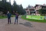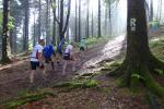 Mit "Hoher Schorn" auf 850 Metern war dann der dritthöchste Aussichtspunkt der Strecke erreicht. Schnell ein Foto mit Uwe vom Team Frankenwild, denn Uwe war an einem ganz anderen Punkt angekommen. Er wollte schlicht und ergreifend aufgeben, hatte genug gesehen vom Höhenweg des Thüringer Waldes, ihm tat einfach alles weh. Da hatte er aber die Rechnung ohne die Bode-Runners gemacht, die alles daran setzten, ihn wieder auf Trab zu bringen. Die Karawane zog weiter und euphorisch wurde das Kilometerschild „50“ gefeiert!