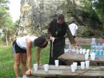 Spätestens mit dem Startschuss über 13 Kilometer waren die Gedanken an den bevorstehenden Muskelkater verschwunden und langsam reihte man sich im Tross der Laufverrückten ein. Die ersten sechs Kilometer verliefen in leichten Wellen, bevor die berüchtigte Treppe hinauf zum Gläsernen Mönch den Lauf abrupt stoppte. Quasi im Gänsemarsch zog sich die Menschenkette pustend die 230 Stufen hinauf, bis ein Mann im Mönchsgewand mit kühlem Nass und Bibel das Ende der Qual erahnen ließ. „Bitte lieber Gott, heile mich von dieser Laufkrankheit!“, konnte man vielen Gesichtern scheinbar entnehmen. Aber weit ab vom Start ging der Weg nur weiter und das zum Glück dann auch bald wieder bergab. Unaufmerksam und wie immer der Fotografie verfallen, stürzte Jens-Uwe Börner über eine Wurzel und konnte nun eine Wunde am Knie sein eigen nennen. Zu diesem Zeitpunkt gab er dann auch Schmidtschneiders Verfolgung auf, widmete sich ganz seinem Hobby und hakte den Lauf als gute Trainingsvorbereitung für den Magdeburg-Marathon ab.