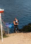 Wir lagen gut im Zeitplan und liefen um Punkt acht Uhr unserem Mitstreiter Chris Anders in die Arme, wenig später kam auch Schlenker am Check In an und wir waren vollzählig. Also Meldeunterlagen abgeholt, Equipment aus dem Auto befördert, ab in den Wechselbereich und schon zeigte die Uhr viertel vor neun! Noch fünfzehn Minuten bis zum Start hieß: Neopren anziehen, kurzer Blick übers Rad, Verpflegung, Radhelm und die Laufschuhe platzieren, den Schalter im Kopf umlegen und mit Tunnelblick zum Wassereinstieg.