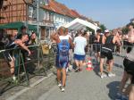 In aller Frühe bereiteten sich am Folgetag die ersten Starter der Gaensefurther Sportbewegung auf die Sprintdistanz vor. Pünktlich um neun Uhr legte der Schaufelraddampfer „Queen Arendsee“ ab. Nach 750 „Seemetern“ führte nur ein Sprung vom Schiff an die gedachte Startlinie zur ersten Disziplin. „Mal sehen ob das noch geht?“ So nahm Annett Lampe ihren ersten Triathlon in diesem Jahr in Angriff und setzte sich bereits beim Schwimmen stark von ihren Verfolgerinnen ab. Als Sprint-Gäste mit dabei, Bode-Runners Jens-Uwe und Sabine Börner, denn die Anmeldung zum Jedermann-Wettkampf war bereits ausgebucht. Wie immer hatten sie ihre Mühe mit dem nassen Element und gingen fast zeitgleich auf die 20 Kilometer Radstrecke. Nach zehn Kilometern ratterten die Rennräder publikumsfreundlich über das Marktplatzpflaster, bevor die zweite Runde anstand. Noch fünf Kilometer laufen, dann war es vollbracht. Und wie es noch ging! Annett Lampe feierte neben ihrem Altersklassensieg sogar den zweiten Platz in der Gesamtwertung der Frauen. Und Sprint-Gast Sabine Börner kann ihren ersten Platz in der Altersklasse Senn2 wohl immer noch nicht richtig glauben.