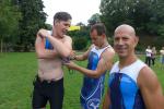 Nach einem Sprung in das kühle Nass sortierten sich die Schwimmer an der gedachten Startlinie. Ohne Neoprenanzug und mitten im See ausgesetzt, galt es nun das 1,5 Kilometer entfernte Ufer zu erreichen. Von den drei Startern der Gaensefurther Sportbewegung entkam Janko Schlenker als erster dem nassen Element. Trotz schlechterer Radzeit konnte er seinen Vorsprung vor Thomas Vetter über die Ziellinie retten. Vetter finishte nur 10 Sekunden hinter Schlenker. Als dritter im Bunde, beendete nach 2:44:10 Stunden Christian Anders ebenfalls seine olympische Distanz. Neben der Schwimmstrecke lagen 40 Kilometer Rad und eine Zehn-Kilometer-Laufrunde um den See hinter ihm.