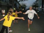 Langsam stieg auch bei den Akteuren des Hauptwettkampfes über die zehn Kilometer der Adrenalinspiegel. Auf der Einlaufrunde die gut gelaunten Zuschauer angesprochen: „Seid ihr nachher auch noch da?“, verschafften sich die Bode-Runners gleich einmal ihre Fanblocks für die fünf zu absolvierenden Stadtrunden. Begleiter und ehemaliger Leichtathlet Dr. Blauwitz gab noch wertvolle Lauftipps, welche natürlich gleich mit ordentlichen Zielzeiten untermalt wurden. Mit einem pünktlichen Startschuss um 19:15 Uhr durch Lehrtes Bürgermeisterin Jutta Voß, setzten sich die 500 Sportler in Bewegung. Auf dem ersten Kilometer sortierte sich das Läuferfeld und langsam fand jeder seinen Rhythmus. Dr. Blauwitz ließ es sich nicht nehmen, die Zwischenzeiten zu kontrollieren, die Bürgermeister und anwesenden Staßfurter Stadträte fieberten an der Strecke mit. Auf der ersten Runde mussten die Fanblocks noch mit Winken auf den Durchlauf hingewiesen werden: „Jetzt!“und los ging das Getöse. Ab Runde zwei warteten die Zuschauer förmlich auf die Staßfurter. Verdutzte Läufer wurden gleich beruhigt: „Die haben wir bezahlt!“ Die Stimmung an der Strecke verursachte Gänsehaut und die Sportler kämpften bis zum Ziel. Ronald Rabenstein errang am Ende einen zweiten Platz von 22 Läufern in der M 55, Sabine Börner landete auf Platz drei von 19 Frauen in ihrer Altersklasse. Nach Ehrungen und Showprogramm ging ein großer Citylauf zu Ende. Satt und zufrieden traten die Gaensefurther kurz vor Mitternacht die lange Heimreise an.