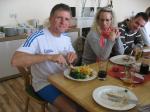 Felix Göres als Neumitglied im cash´n fun Junior Team der Salzlandsparkasse, hatte es mächtig eilig wieder in das Ziel zu kommen. Seine 5,7 Kilometerstrecke bog bereits wieder in Richtung Sportforum ab und auch die zehn und 14,3 Kilometerläufer gingen bald getrennte Wege. Nach einem rasanten Gefälle mit Wurzelwerk, Felsen, Treppen und Holzstegen, erholten sich die Läufer auf einer kurzen geraden Passage. Zeit, um ein paar tiefe Züge Waldluft einzuatmen, denn der nächste Hügel ließ nicht lange auf sich warteten. Ohne Probleme meisterten Johannes Höber und Martin Wille den Zehn-Kilometer-Crosslauf. Ihre schnellen Zeiten wurden, ebenso wie bei Felix über die 5,7 Kilometer, mit einer Silbermedaille gekrönt. Maximilian Gäde, das erste Mal über eine Zehn-Kilometer-Distanz, freute sich über einen dritten Platz in seiner Altersklasse. Bei den Damen konnte Ina Schöler von der ZLG Atzendorf ihren zweiten Platz aus dem Vorjahr in eine Goldmedaille verwandeln. Und auch Isa Höber von den Bode-Runners war mit einem zweiten Platz in der stark besetzten Frauenklasse mehr als zufrieden. Alle Teilnehmer meisterten das anspruchsvolle Streckenprofil und kamen gut gelaunt und verletzungsfrei in das Ziel. Mutig bewältigte Sylvia Köhn ihren ersten Berglauf, Annegret Wille war wieder mit am Start und auch Neumitglied Jürgen Eisfeld schien sich sichtlich wohl zu fühlen. Bereits zur Tradition geworden, gönnte sich die Mannschaft im Restaurant „Zum Ziegenkopf“ einen dicken Hefekloß als Belohnung. Genug Nahrung für den nächsten Wertungslauf im Gaensefurther Läufercup!