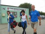 Spätestens mit dem Startschuss über 13 Kilometer waren die Gedanken an den bevorstehenden Muskelkater verschwunden und langsam reihte man sich im Tross der Laufverrückten ein. Die ersten sechs Kilometer verliefen in leichten Wellen, bevor die berüchtigte Treppe hinauf zum Gläsernen Mönch den Lauf abrupt stoppte. Quasi im Gänsemarsch zog sich die Menschenkette pustend die 230 Stufen hinauf, bis ein Mann im Mönchsgewand mit kühlem Nass und Bibel das Ende der Qual erahnen ließ. „Bitte lieber Gott, heile mich von dieser Laufkrankheit!“, konnte man vielen Gesichtern scheinbar entnehmen. Aber weit ab vom Start ging der Weg nur weiter und das zum Glück dann auch bald wieder bergab. Unaufmerksam und wie immer der Fotografie verfallen, stürzte Jens-Uwe Börner über eine Wurzel und konnte nun eine Wunde am Knie sein eigen nennen. Zu diesem Zeitpunkt gab er dann auch Schmidtschneiders Verfolgung auf, widmete sich ganz seinem Hobby und hakte den Lauf als gute Trainingsvorbereitung für den Magdeburg-Marathon ab.