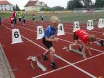 Fabienne Sämisch (w9) stellte sich der Konkurrenz im Dreikampf und im 600m Lauf. Für ihre Ergebnisse von 9,16s(50m)/2,96m(weit)/ 21,50m(Ball) im Dreikampf standen 874 Punkte (PB) und Rang 6 am Ende zu Buche. Besonders machte sie aber im 600m Lauf auf sich aufmerksam. Am Anfang unter den Führenden, musste sie das Tempo wegen Schmerzen im Oberschenkel reduzieren und fiel zurück. Auf der Zielgeraden biss das zierliche Mädchen dann aber die Zähne zusammen, überholte kurz vor der Ziellinie noch eine Konkurrentin und kam mit PB von 2:27,13 Minuten ins Ziel. Auch wenn sie die Sympathien der Zuschauer gewonnen hatte, für einen Podestplatz reichte es leider nicht.