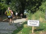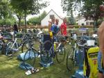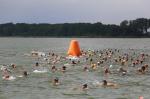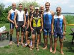 Nun waren auch die Deutschen Polizeimeisterschaften mit 110 Beamten aus 15 Bundesländern auf den Strecken. Die besten von ihnen werden zu den Europameisterschaften fahren. Für die nächsten Triathleten der Gaensefurther Sportbewegung, die sich auf die Olympische Distanz vorbereiteten, boten sie einen kleinen Vorgeschmack auf das, was da kommen sollte. Als die sieben Sportler noch gut gelaunt vom ablegenden Schiff winkten, wussten sie noch nicht, auf welches Abenteuer sie sich da einließen. Für die Zuschauer nur noch als kleiner Punkt sichtbar, entließ „Queen Arendsee“ ihre Passagiere fast am anderen Ende des Sees. „Wenn es aussieht wie beim Fische füttern, kann man davon ausgehen, dass der Start erfolgt ist.“ versicherte Jürgen Salffner, Präsident des Triathlonverbandes Sachsen-Anhalt, den halsrekelnden Zuschauern. In Mitte des Sees konnten dann die Führenden erahnt werden, als sich von der westlichen Seeseite ein mächtiges Unwetter zusammen braute. Die ersten, unter ihnen auch Martin Wille vom cash`n fun Junior Team der Salzlandsparkasse, hatten Glück und entkamen der wilden See. Dann wurde es immer dramatischer. Während der Schaufelraddampfer zur Rettung eines gekenterten Segelbootes gerufen wurde, begannen die begleitenden Rettungsboote die letzten Schwimmer aus dem Wasser zu ziehen. Für jene war der Wettkampf an dieser Stelle beendet. Alle Gaensefurther hatten Glück, erreichten das rettende Ufer und sprinteten hinauf zum höher gelegenen Wechselgarten. Die Radschuhe waren mit Wasser gefüllt, manch bereitgelegter Traubenzucker oder die am Rad gehängte Startnummer hatten dem Starkregen nicht stand gehalten. Nach ihren bescheidenen Schwimmzeiten nahmen Detlef Schäfer und Matthias Lampe die Verfolgung auf. Mit starken Rad- und Laufzeiten, bei inzwischen wieder strahlendem Sonnenschein, fanden beide in den Wettkampf zurück. Schäfer, nach seinem Ironman weiterhin in Bestform, finishte am Ende als schnellster Gaensefurther. Die als Landesmeisterschaft ausgetragene Distanz krönte er mit einem dritten Platz in seiner Altersklasse. Gefolgt von Wille, auf dem letzten Laufkilometer wegen Blasen nur mit einer Sohle beschuht, landete sogar den Landesmeistertitel. Die Salzlandsparkasse hat da eindeutig auf das richtige Pferd gesetzt! Am Ende klatschten alle Triathleten zufrieden und schmunzelnd ab: „So ein Kampf mit den Elementen hatten wir auch noch nicht!“