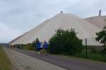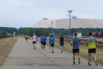 Am ersten Getränkestand noch einmal aufgetankt, lag er dann in seiner vollen Dimension vor den Läufern: Der berühmt, berüchtigte Kalimandscharo. Nun kam nicht nur für die Läufer der erste Anstieg - auch für das Förderband ging es bergauf. Der Weg auf dem hellen Abraummaterial blendete extrem. Verflixt, gab es doch beim Start bei bedecktem Himmel garkeinen Grund für den Einsatz von Sonnenbrillen.