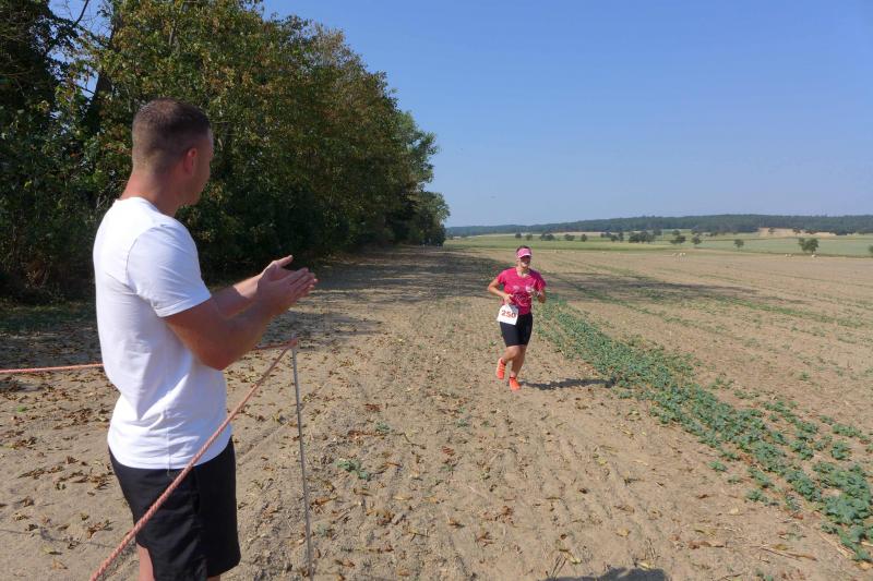 Was den Untergrund betraf, hatte die Strecke alles zu bieten und verdiente zweifelsohne das Prädikat „Cross“. Betonplatten führten über die erste Anhöhe, bevor eine Gabelung die Kurzstrecke über drei Kilometer bald von der Sechs-Kilometer-Distanz trennte. Auf weichen Waldwegen musste man lediglich den zahlreichen Kienäpfeln ausweichen. Ganz nach dem Geschmack für Barfußläufer, wechselten sich holprige Stoppelwiesen mit tiefen Sandwegen ab, bevor auch schon wieder eine weitere Anhöhe zu erklimmen war. Ehe es aus dem Wald hinaus auf eine Lichtung ging, versorgte ein Verpflegungsstand mit Getränken. Der Hinweis, die leeren Becher wieder in die bereitgestellten Abfallbehälter zu werfen, brachte manchen Läufer aus dem Tritt, denn oft verfehlte die Arm-Motorik das enge Ziel. Das muss vor den nächsten Wettkämpfen unbedingt geübt und weiter verinnerlicht werden! Die große Lichtung erlaubte eine Ausschau auf das Renngeschehen, machte Abstände sichtbar und offerierte eine weitere Anhöhe, die zu bewältigen war. Aber es ging dann auch mal bergab, bevor ein Streckenposten bei Kilometer 5,3 die letzte Steigung ankündigte. Die geschafft, ging es für alle Sechs-Kilometer-Läufer rasant bergab in das wohlverdiente Ziel.