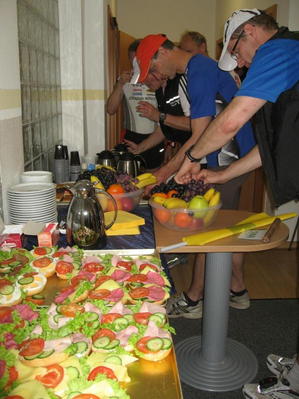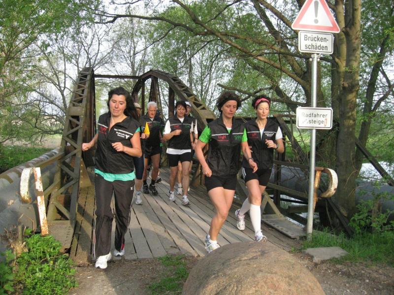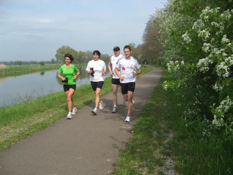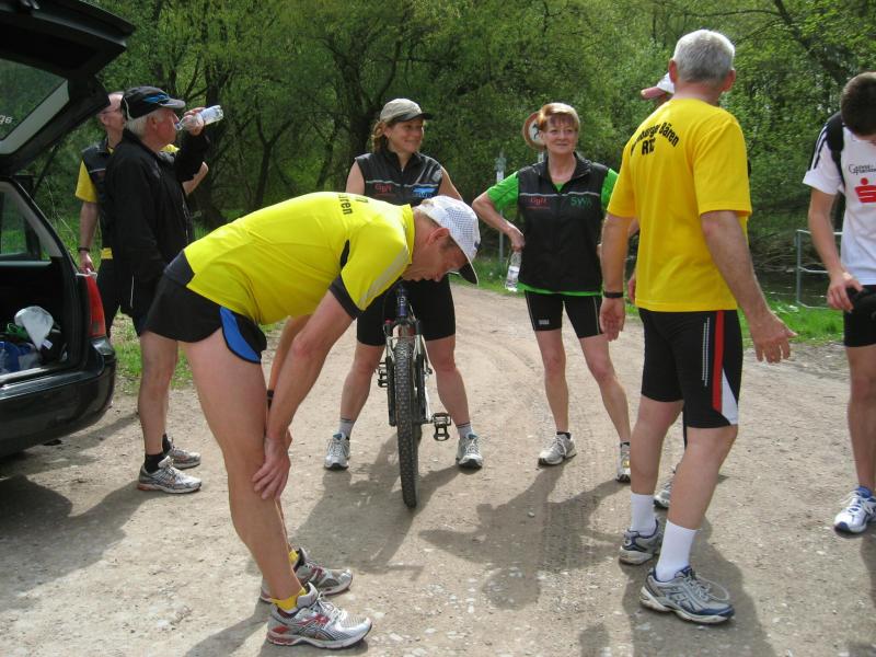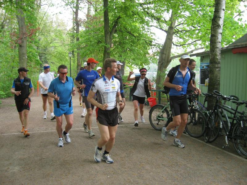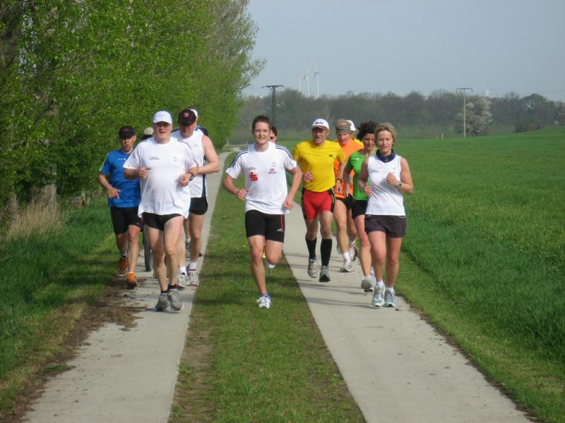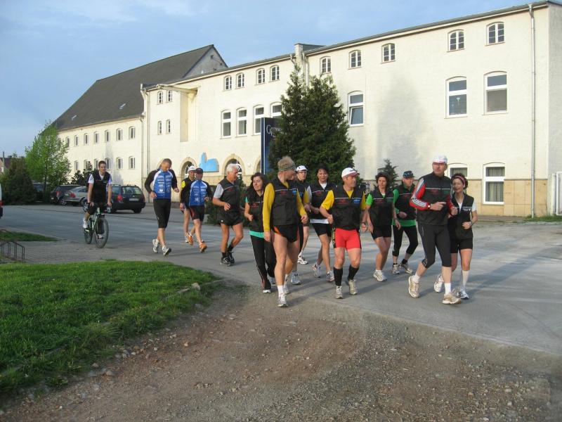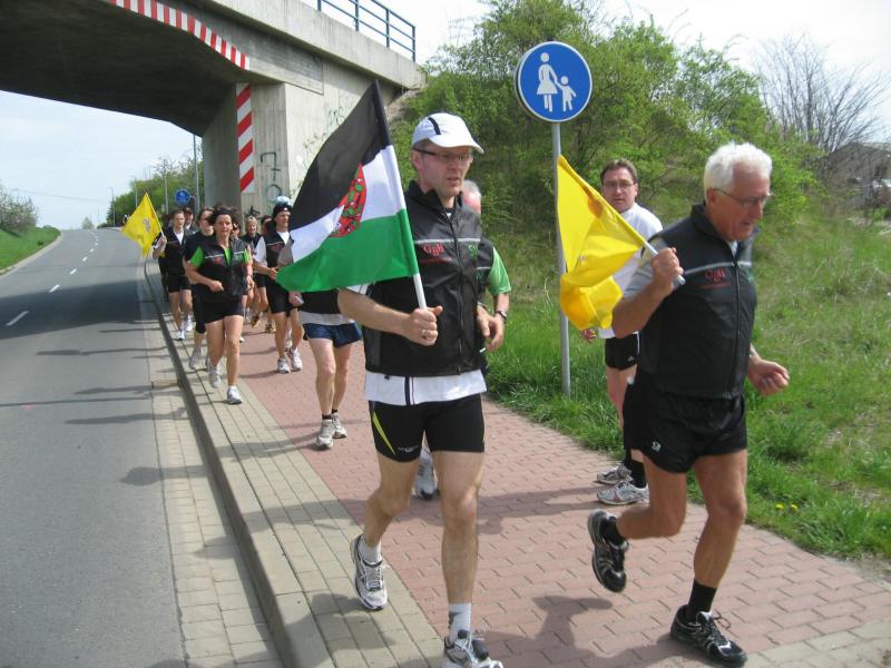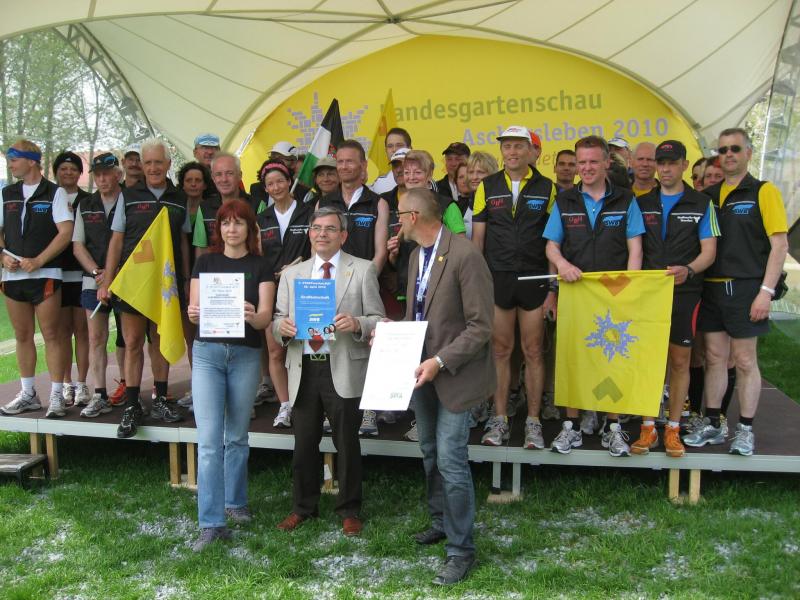 Nachdem sich zu früher Stunde bereits eine große Gruppe von Läufern der beteiligten Laufgruppen vor der Gaensefurther Schlossbrunnen Wüllner GmbH eingefunden hatte, verabschiedete deren Geschäftsführer Horst Braunisch die Teilnehmer, nicht aber ohne ihnen einen PKW voll mit erfrischendem Naß mit auf die Reise zu geben. Über die Roßbahn ging es dann zur 1. Etappe nach Staßfurt zu den Stadtwerken, wo die Läufer schon von OB René Zok und Betriebsangehörigen erwartet wurden. Die Übergabe der Staffelstäbe und die Einnahme einer kleinen Wegzehrung hingegen mussten zügig abgewickelt werden, hatte man doch durch einen Termin bei der LAGA in Aschersleben einen straffen Zeitplan vorgegeben. Wenn die Landesgartenschau für die älteste Stadt Sachsen-Anhalts das absolute Highlight des Jahres ist, warum nicht auch in den diesjährigen Stadtwerkelauf einbinden, dachten sich die Läufer von Ascania Aschersleben und sorgten damit für eine nette Bereicherung der Tagesplanes. Bei warmen, aber angenehmen Wind ging es weiter nach Bernburg, entlang der Bode und der Saale, deren Auen sich frühlingshaft geschmückt zeigten. Schon allein dieses Flair entschädigte für so manche Strapazen. In Bernburg bei den Stadtwerken angekommen, folgte dann der gewohnt herzliche Empfang mit Übergabe der Grußbotschaften, ergänzt durch einen leckeren Imbiß und weiter ging’s. An Verpflegung unterwegs mangelte es ebenfalls nicht. Die von Gaensefurther gesponserten Getränke und die Lunchpakete vom Speiseservice RiRo ließen diesbezüglich fast keinen Wunsch offen. Hatte trotz alledem ein Aktiver konditionelle Probleme, konnte er sich in einem der vier Begleitfahrzeuge erholen. 2 Sportler mussten leider ihren Plan, die gesamte Strecke durchzulaufen, nach 50 km aufgeben, denn das hohe Lauftempo forderte seinen Tribut. Bei dieser Eile übersah dann in den engen Promenaden von Aschersleben prompt ein Läufer einen Poller und es kam zu einer schmerzhaften Kollision. Aber zum Jammern blieb wenig Zeit, denn die Landesgartenschau wartete. Auf der Bühne im Weingarten war dann einige Prominenz versammelt und mittendrin unsere Helden mit den flinken Beinen, überwältigt vom folgenden Blitzlichtgewitter. Nachdem die eigentliche Mission des Laufes, die Übergabe einer Grußbotschaft auch an die Stadtwerke Aschersleben abgehandelt war, die die gute Zusammenarbeit auf kulturellem, wirtschaftlichen und natürlich sportlichem Gebiet dokumentieren soll, folgte die letzte Etappe der insgesamt 70 km langen Strecke.