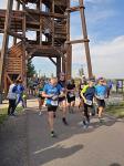 Vom Aussichtsturm „Leonhardt“ gingen jeweils zehn Starter im Minutentakt auf die Reise. Elf Gaensefurther waren auf der Kurzstrecke mit dabei. Da hatten es die Fahrgäste im Geiseltal-Express doch etwas bequemer. Unbeeindruckt und manchmal gefährlich nahe, zog die bunte Kleinwegebahn an den Läufern vorbei. In leichten Wellen ging es auf dem Geiseltalrundweg entlang, bevor die letzten drei Kilometer direkt am See zurückführten. Nach dem großen Zielbogen am Besucherzentrum Marina wurden alle Finisher herzlich begrüßt. Zehn Sekunden schneller als im vorigen Jahr, fuhr Sandra Homann (1. Platz Altersklasse W40) im vereinsinternen Duell den Sieg für sich ein, gefolgt von Jana Berger (1. Platz W50) und Janine Wuwer (3. Platz W35).