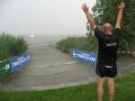 Nun waren auch die Deutschen Polizeimeisterschaften mit 110 Beamten aus 15 Bundesländern auf den Strecken. Die besten von ihnen werden zu den Europameisterschaften fahren. Für die nächsten Triathleten der Gaensefurther Sportbewegung, die sich auf die Olympische Distanz vorbereiteten, boten sie einen kleinen Vorgeschmack auf das, was da kommen sollte. Als die sieben Sportler noch gut gelaunt vom ablegenden Schiff winkten, wussten sie noch nicht, auf welches Abenteuer sie sich da einließen. Für die Zuschauer nur noch als kleiner Punkt sichtbar, entließ „Queen Arendsee“ ihre Passagiere fast am anderen Ende des Sees. „Wenn es aussieht wie beim Fische füttern, kann man davon ausgehen, dass der Start erfolgt ist.“ versicherte Jürgen Salffner, Präsident des Triathlonverbandes Sachsen-Anhalt, den halsrekelnden Zuschauern. In Mitte des Sees konnten dann die Führenden erahnt werden, als sich von der westlichen Seeseite ein mächtiges Unwetter zusammen braute. Die ersten, unter ihnen auch Martin Wille vom cash`n fun Junior Team der Salzlandsparkasse, hatten Glück und entkamen der wilden See. Dann wurde es immer dramatischer. Während der Schaufelraddampfer zur Rettung eines gekenterten Segelbootes gerufen wurde, begannen die begleitenden Rettungsboote die letzten Schwimmer aus dem Wasser zu ziehen. Für jene war der Wettkampf an dieser Stelle beendet. Alle Gaensefurther hatten Glück, erreichten das rettende Ufer und sprinteten hinauf zum höher gelegenen Wechselgarten. Die Radschuhe waren mit Wasser gefüllt, manch bereitgelegter Traubenzucker oder die am Rad gehängte Startnummer hatten dem Starkregen nicht stand gehalten. Nach ihren bescheidenen Schwimmzeiten nahmen Detlef Schäfer und Matthias Lampe die Verfolgung auf. Mit starken Rad- und Laufzeiten, bei inzwischen wieder strahlendem Sonnenschein, fanden beide in den Wettkampf zurück. Schäfer, nach seinem Ironman weiterhin in Bestform, finishte am Ende als schnellster Gaensefurther. Die als Landesmeisterschaft ausgetragene Distanz krönte er mit einem dritten Platz in seiner Altersklasse. Gefolgt von Wille, auf dem letzten Laufkilometer wegen Blasen nur mit einer Sohle beschuht, landete sogar den Landesmeistertitel. Die Salzlandsparkasse hat da eindeutig auf das richtige Pferd gesetzt! Am Ende klatschten alle Triathleten zufrieden und schmunzelnd ab: „So ein Kampf mit den Elementen hatten wir auch noch nicht!“