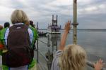 In der langen Warteschlange zur Abholung der Startunterlagen ging der Blick oft nach oben. Dicke Regenwolken thronten am Himmel und entleerten sich immer wieder in kleinen Huschen über den Arendsee. Die Teilnehmer der olympischen Distanz hatten den Kampf mit den Elementen aus dem Vorjahr noch gut in Erinnerung. Haarscharf entkamen sie damals dem tobenden See, was für einige bereits nach der Schwimmdistanz das unwiderrufliche Aus bedeutete. So bestand der Veranstalter in diesem Jahr auch wieder auf die Badekappenpflicht. Nur mit diesem auffallenden Utensil ausgestattet, war der Zutritt zum Schaufelraddampfer „Queen Arendsee“ freigegeben. Promi Antje Buschschulte begleitete als Zuschauerin und zum Daumen drücken ihren Ehemann Helge Meeuw auf der „Queen“. Während der Fahrt zum Start, lauschten die Teilnehmer angespannt den letzten Hinweisen der Wettkampfleitung. Dann ging alles ganz schnell.