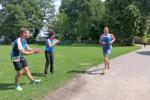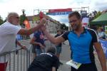 Erst um 13.00 Uhr wurde es dann auch für die 133 Starter über die Jedermann-Distanz ernst. Für den Newcomer Thomas Mohr aus Löderburg, sollte der Triathlon in Arendsee ein unvergessenes Erlebnis werden. Hier war Sabine Börner in ihrem Element, denn nichts liegt ihr mehr, als Debütanten vom Sport zu begeistern. Herrlich unwissend, nahm Mohr dankend jeden Hinweis an, zumal Zeitvorgaben keine Rolle spielten und lediglich das Überqueren der Ziellinie als Maßstab galt. Ein letztes Mal brachte sich die „Queen Arendsee“ in Position und als Mohr seine Brille nach dem Sprung ins Wasser wieder auf der Nase platziert hatte, ging es auch schon los. Die Wellen hielten sich zurück und auch die Brille hielt bis zum anvisierten Ufer. Jens-Uwe Börner wechselte nach dem Schwimmen 15 Sekunden eher auf das Rad als Sabine – ein Schock, dass gab es im Triathlonkampf der Eheleute noch nie! Auf der 20 Kilometer langen Radstrecke begegnete man dem Debütanten Mohr dann zwei Mal. Das schwere Mountainbike erinnerte Börner an seine ersten Triathlon-Starts und die mitgenommene Capri-Sonne ließ Sabine immer noch leicht schmunzeln. Beruhigend, dass sich Mohr für die anstehende Fünf-Kilometer-Laufeinheit noch ein paar Sahnebonbons als Energiereserve bereit gelegt hatte. Beide Börners hatten es fast geschafft, da wechselte auch Mohr auf die Laufstrecke. Während die Wartenden im Zielbereich den rührenden Heiratsantrag eines Triathleten-Pärchens verfolgen konnten, war für Mohr Durchhalten angesagt. Und wie er durchhielt! Gepuscht durch die Sprecheransage und dem Applaus der vielen Zuschauer, legte Mohr auf der langen Zielgeraden einen sehenswerten Schlussspurt hin. Da wurden Reserven mobilisiert, die zweifellos ausbaufähig sind! Ein überglücklicher Thomas Mohr feierte seinen ersten Triathlon und die Sportler der Gaensefurther Sportbewegung feierten gerührt mit. Trotz Aussicht auf einen heftigen Muskelkater vereinbarten die Finisher eine Neuauflage im nächsten Jahr.