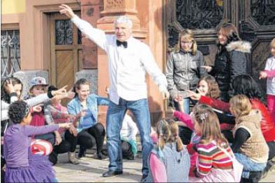 Szenenwechsel: Nachdem die Tanzszenen auf der Burg im Kasten waren, zogen die Mädchen zum Rathaus. Und auch dort schallte schon bald laute Musik über den Marktplatz. Und dort hatte auch der Bürgermeister seinen Soloauftritt, den er unter reichlich Applaus meisterte. Der Spaßfaktor stieg immer weiter, das Frühlingswetter tat sein übriges.