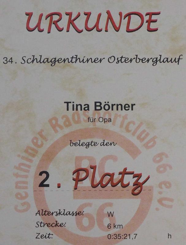 Jahrelang stand der Osterberglauf in Schlagenthin bei Genthin im Wettkampfkalender der Bode-Runners, aber immer kam etwas anderes dazwischen. Diesmal hat es Familie Börner endlich mal wahr gemacht, an dieser für seine gute Organisation bekannten Veranstaltung teilzunehmen. Ausgeschrieben waren Strecken über 6 und 12 Kilometer. Nach einem lockeren Lauf schafften Sabine und Tina Börner den Sprung aufs Podest. In der Altersklassenwertung belegten beide Platz 2 über 6 Kilometer, während Jens-Uwe in seiner Altersklasse Siebter über 12 Kilometer wurde.