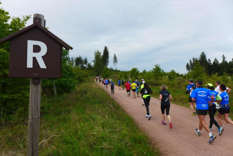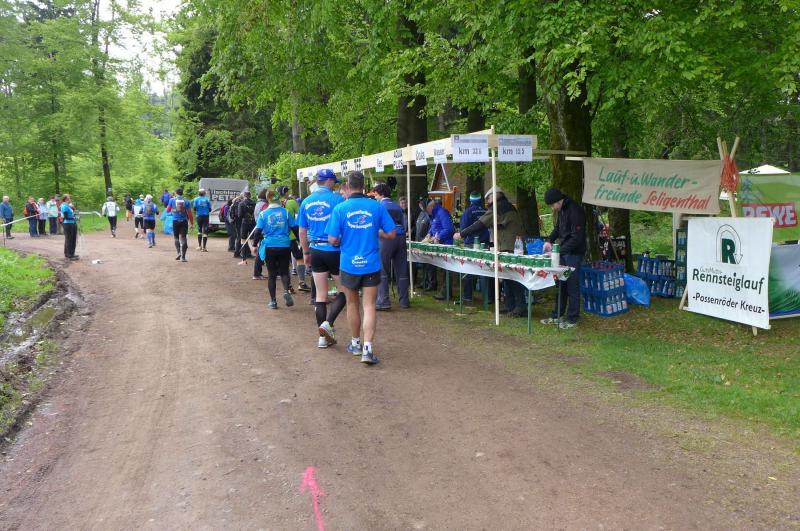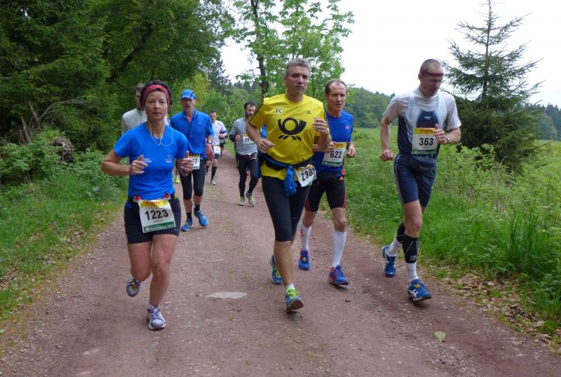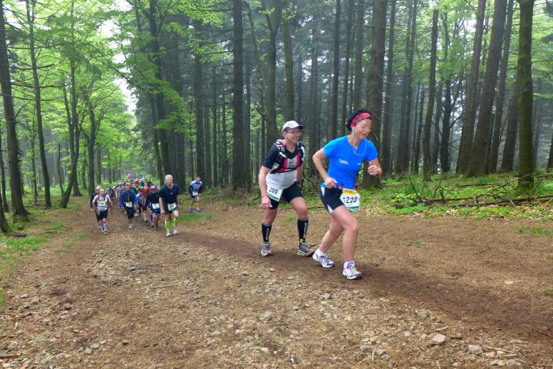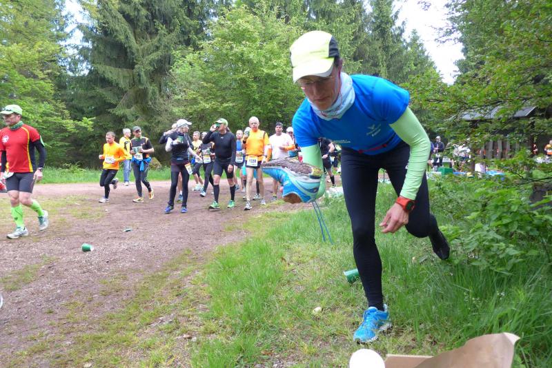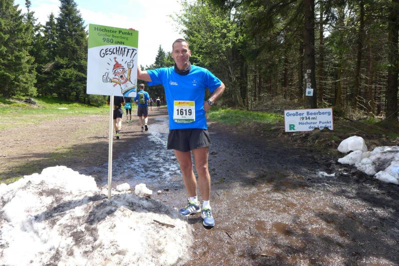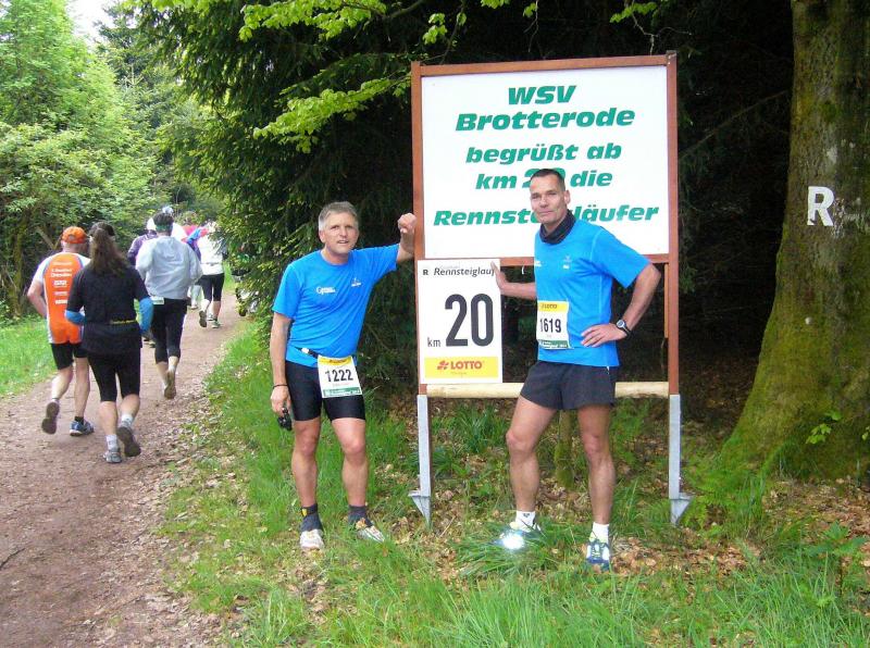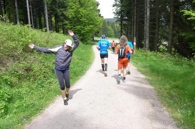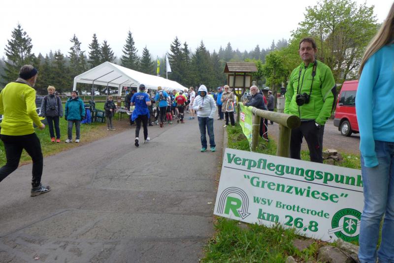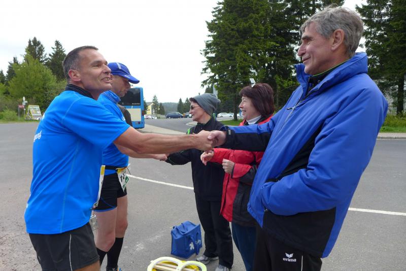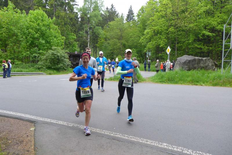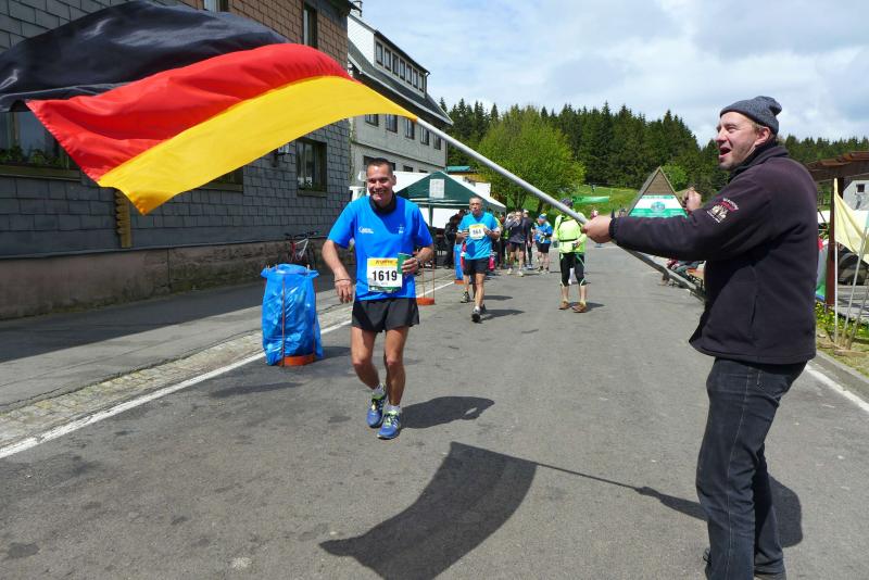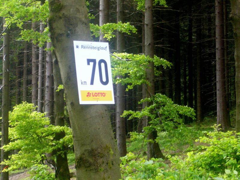 Dem frühen Startschuss um 6.00 Uhr im noch schlafenden Eisenach, gingen viele harte Trainingswochen voraus. Mehrere Marathons, Tempo- und Bergläufe waren absolviert, einzig mit dem Ziel, diesen Ultra-Marathon durchzuhalten. Während es für Jens-Uwe und Sabine Börner der vierte Start zu einem Ultralauf war, bewegten sich Katrin Winkler-Hindricks, Dirk Meier und Jörg Schäper jenseits der 42,195 Kilometer auf unbekanntem Terrain. Leicht fröstelnd, war Kilometer „1“ durch Eisenachs Innenstadt wohl der erste und auch gleich der letzte einfache Abschnitt. Schmunzelnd wurde ein aufgestelltes Ortsausgangsschild registriert, auf dem das Ziel Schmiedefeld mit 72 Kilometern ausgewiesen war. Von nun an ging es bis Kilometer 25,5 stetig bergauf, denn der Große Inselsberg mit 916 Höhenmetern wollte als erstes Etappenziel bezwungen werden. Alle fünf Bode-Runners waren noch dicht beisammen und hatten sich nach drei Stunden Aufstiegsarbeit noch wichtige Körner aufgespart. Bei kühlen fünf Grad Celsius verhinderte dichter Nebel den so hart erkämpften Panoramablick. Zur nächsten großen Verpflegungsstelle "Grenzwiese" ging es rasant bergab auf 746 Höhenmeter. „Das müssen wir nachher alles wieder hoch!“ resümierte Börner und schob sich zur Stärkung lieber noch ein Schmalzbrot in den Mund. Die Frauen beließen es bei warmen Tee und einem schmerzverzerrten Biss in gesalzene Zitronenviertel. Und weiter ging die Reise, jeder in seinem eigenen Tempo. Nicht alle Läufer freuten sich über die inzwischen wärmende Sonne, welche jedoch eine herrliche Sicht vom Höhenweg in das Umland ermöglichte. An der Verpflegungsstation „Ebertswiese“ war die Hälfte der Strecke geschafft. Einen Becher Haferschleim und ein letztes Foto mit Frau Sabine, denn von da an bekam er seine Gattin nicht mehr zu sehen. Beide Frauen spulten Kilometer für Kilometer ab, während in der Männerriege wichtige Fototermine oder Magen- und Muskelprobleme den Vorrang hatten. Ab Kilometer 60 nahm die Strecke einen holprigen Verlauf mit kleinen Hügeln, die inzwischen schon mächtig weh taten. Aber mit "Plänckners Aussicht" auf 973 Metern war der höchste Punkt des Rennsteigs erreicht und als kleine Bergprämie präsentierte man den Läufern die letzten Schneereste. Woher die wohl importiert waren?