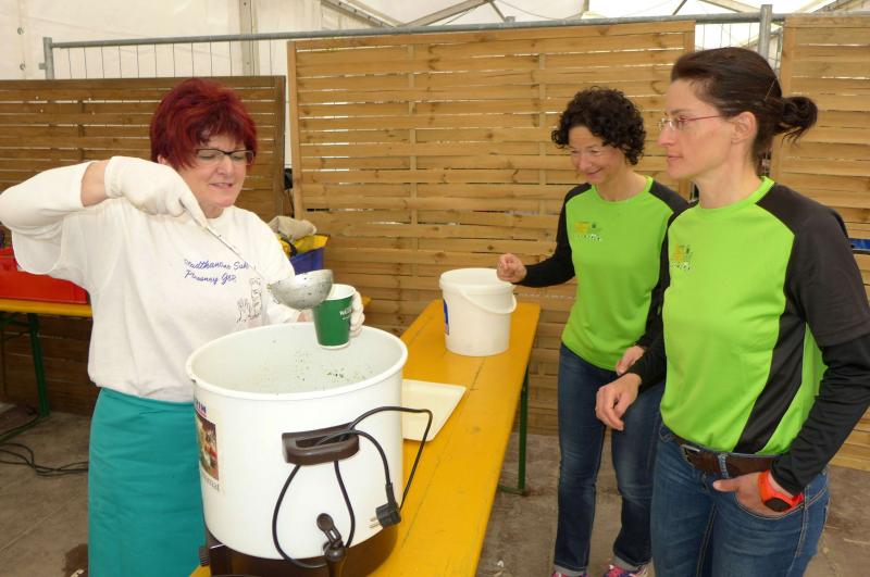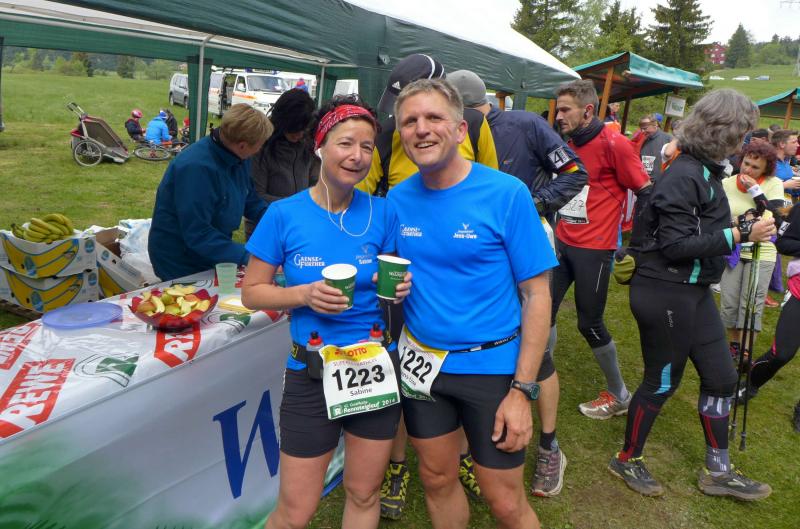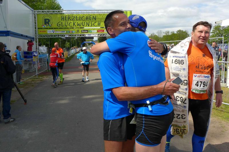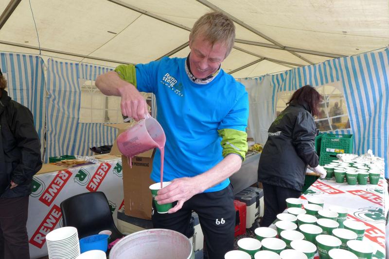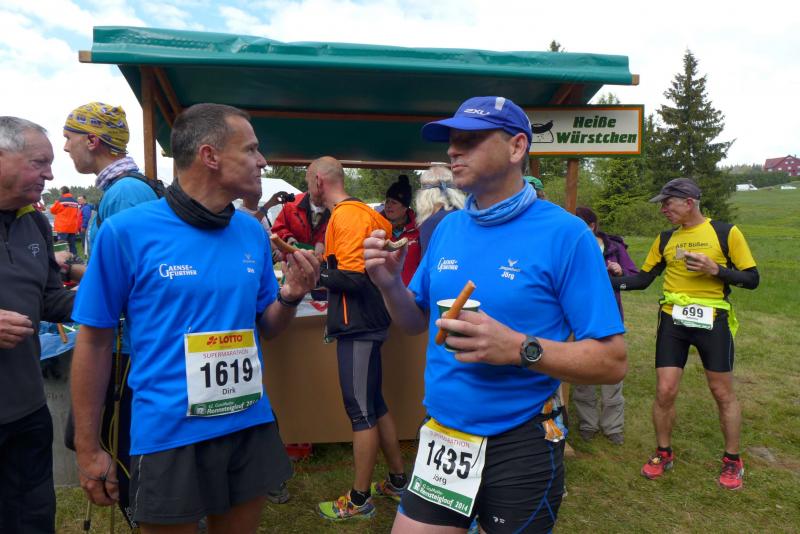 Die beiden Gaensefurther im Ziel hatten indes genug Zeit zum Duschen und warteten zusammen mit dem mitgereisten Fanblock auf die Ankunft der ausstehenden Ultraläufer. Aber auch nach acht Stunden suchte man vergebens nach den blauen Shirts, hätte man zumindest Jens-Uwe Börner längst zurück erwartet (Zielzeit 2013: 07:47:37 Stunden). Umso überraschter bejubelten die Freunde Katrin Winkler-Hindricks, welche nach starken 08:42:32 Stunden ihren allerersten Ultramarathon ins Ziel brachte. Nur sechs Minuten später und damit eine dreiviertel Stunde schneller als im vergangenen Jahr, war mit Sabine Börner auch die zweite Bode-Runners-Frau im Ziel. Bevor man sich dann langsam Sorgen machte, wurde das Männer-Trio zum Glück in der Ferne ausgemacht. Geschafft aber rundum zufrieden, hatten sie sich gemeinsam durchgebissen. Nicht zuletzt auch durch die üppig beladenen Verpflegungsstände. 09:16:00 Stunden Laufarbeit Nonstop hatten die Beine hinter sich. - Ein Ergebnis, dass man natürlich unmöglich so stehen lassen kann! Eine Neuauflage muss her, vielleicht in zwei Jahren. - Dann aber mit dosiertem Training und ohne Würstchen und Schmalzstullen auf dem Weg ins Ziel?