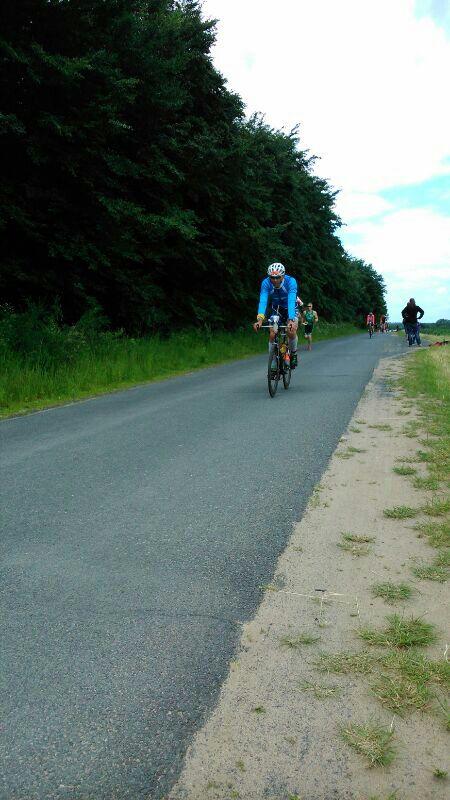 Steffen Schöler, der unterdessen schon fast seine erste von vier zu durchfahrenden Radrunden absolviert hatte, war über seine getroffe Kleiderwahl (langes Rad-Shirt) sehr glücklich. Auch wenn es beim Anziehen wertvolle Zeit gekostet hat, denn der Wettergott meinte es in Niedersachsen nicht ganz so gut mit den Sportlern. Die Maximalwerte von 17°C und keine Sonne sind nicht unbedingt die Lieblingstemperaturen der meisten Triathleten.