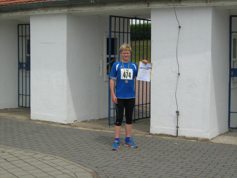 Der Speerwettkampf zog sich über 2 Stunden hin und somit wurde der Konzentration viel abverlangt. Nach dem 1. Durchgang führte Marek die Konkurrenz von 9 Teilnehmern an mit einer Weite von 32,50 Meter. Nach dem 2. Durchgang war klar, dass der Sieg nicht so leicht zu holen war, trumpfte doch sein Mitstreiter Nils Oheim von Turbine Halle mit 36,37 Metern auf. Marek konnte sich bei den nächsten Würfen noch steigern, brachte den Speer im letzten Versuch mit neuer persönlicher Bestleistung bei 35,01 Meter zum Landen, den Hallenser Werfer konnte er jedoch nicht vom Thron stoßen. Somit hatte er die Silbermedaille sicher, denn den Nächstplatzierten ließ er mit 33,00 Metern weit hinter sich. Ein toller Erfolg für den Gymnasiasten aus Tarthun, der erst am Anfang seiner Karriere in dieser Disziplin steht.