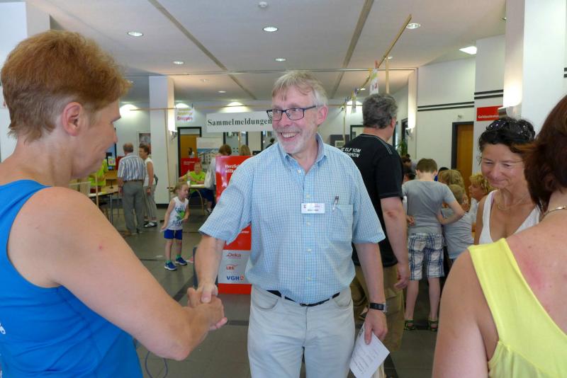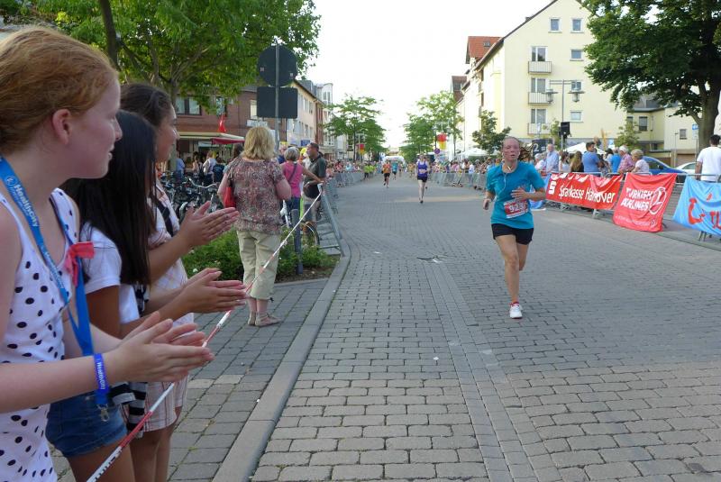 Beim Start des Hauptlaufes über fünf Runden konnte man dann schon vom „Abend“-City-Lauf sprechen. Die heiße Luft stand in den Straßen, aber die tiefere Sonne legte die Häuserfronten bereits in längere Schattenabschnitte. Jens-Uwe und Sabine Börner hatten den schnellen Rundkurs noch in guter Erinnerung, für Sylvia Köhn war es die erste Teilnahme beim Lehrter Citylauf. Auf der gesamten Strecke herrschte Volksfeststimmung. Aufgestellte Rasensprenger sorgten für Abkühlung, bei Bedarf bestand auch die Möglichkeit sich mit einer Ladung aus dem Wasserschlauch anspritzen zu lassen. Runde für Runde spulten die Bode-Runners ihre Kilometer ab, an jedem Getränkestand wurde zusätzlich Wasser getankt. Angefeuert von den vielen Zuschauern musste der Zielbogen vier Mal durchlaufen werden, bevor er endlich ein letztes Mal auf der Zielgeraden zu deuten war. Geschafft! Jens-Uwe Börner erlief von 63 Startern in der Altersklasse M50 einen zweiten Platz! Gewinner waren am Ende alle, denn wer es bei diesem 13. Lehrter Abend-City-Lauf ins Ziel geschafft hatte, erlebte seine ganz eigene Laufgeschichte. Zufrieden über das Geschaffte und über eine meistergültig organisierte Veranstaltung, ging für die Gaensefurther kurz vor Mitternacht die Reise wieder in Richtung Sachsen-Anhalt.