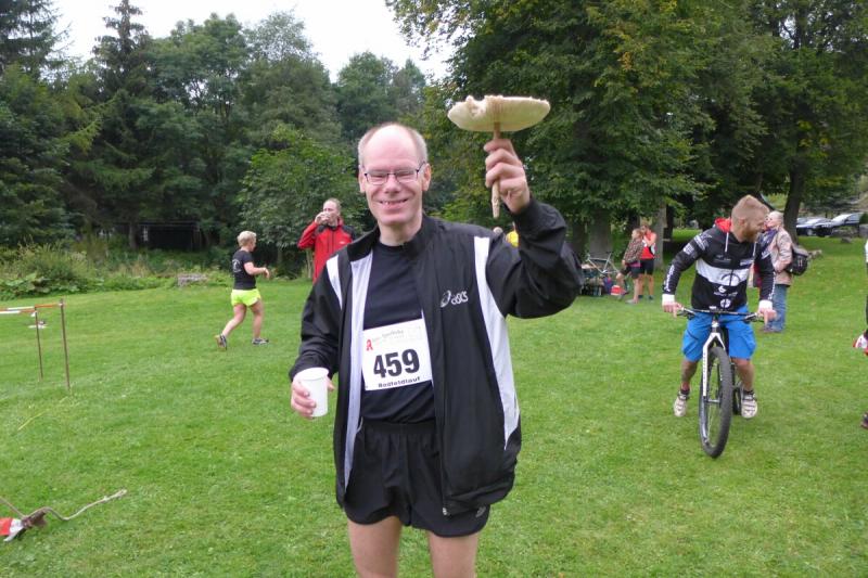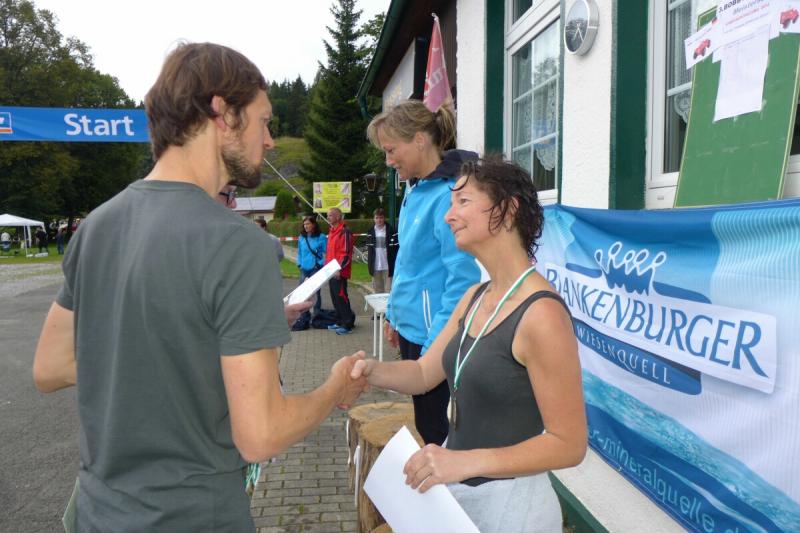Über herrliche Wald- und Wiesenwege war bald die Talsperre Königshütte erreicht, dann ging es rasant bergab, bis den Läuferbeinen der nächste Anstieg zur Ruine Königsburg bevorstand. Es roch nach frisch geschnittenem Kiefernholz und übergroße Pilze grüßten vom Wegesrand. Am Verpflegungsstand nach 9,5 Kilometern trennten sich die Strecken und Renate Liedtkes erster Platz in der Altersklasse W60 war nur noch 500 Meter entfernt. Für die Langdistanz ging es wieder auf 500 Höhenmeter, Schwerstarbeit durch matschige Wiesen und über kurvige, wurzelreiche Trampelpfade. Scheinbar war man hier den Wolken so nahe, dass es fein nieselte, was aber eher als angenehm empfunden wurde. Der Wirtschaftsweg vor dem Stausee Mandelholz brachte weitere Erholung, bevor die Fähnchen an den Bäumen die Läufer wieder in den dichten Wald lotsten. Das Teilnehmerfeld hatte sich inzwischen weit auseinander gezogen, so dass man oft keinen Läufer mehr vor sich sah. Der Stausee war umrundet und an der Kalten Bode ging es wieder zurück nach Königshütte.