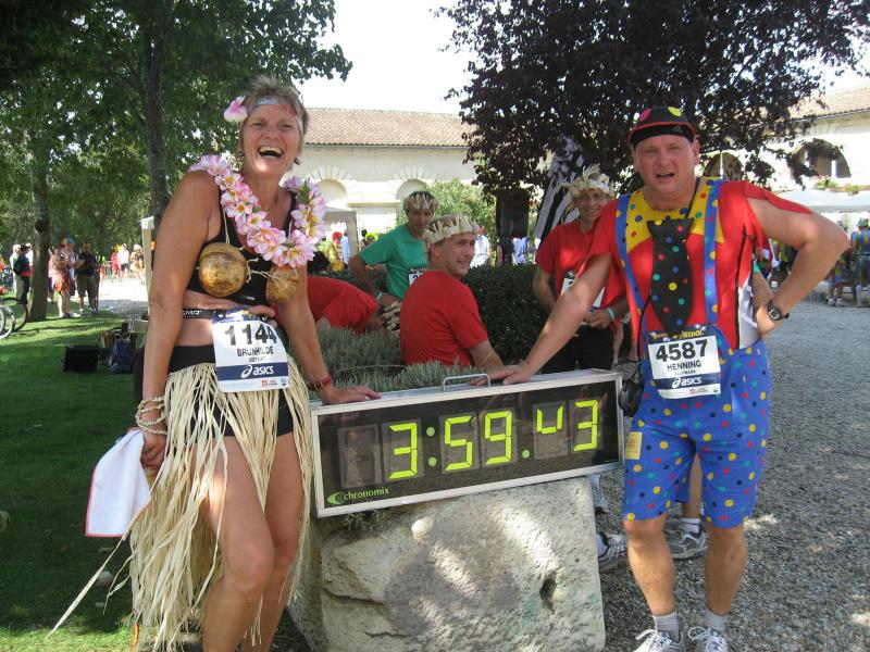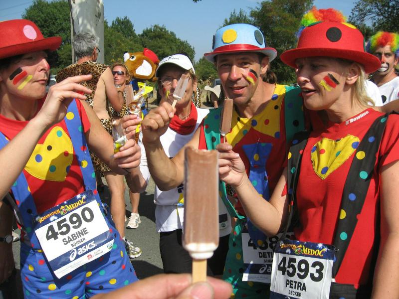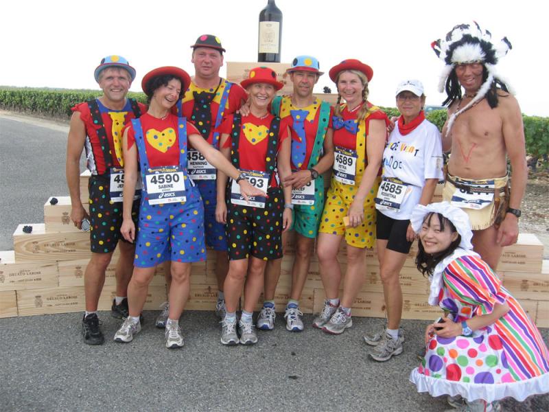Neun Bode-Runners der Gaensefurther Sportbewegung gehörten zu den glücklichen Teilnehmern am Marathon des Chateaux du Medoc. Zusammen mit Sportlern aus Halberstadt, Aschersleben, Bernburg und Frankfurt bezog man im Feriendorf Lacanau an der südfranzösischen Atlantikküste Quartier. Ein sonnenverwöhntes Paradies unweit der Chateaus, welche sich durch die edelsten Weine dieser Erde ihren Namen machten. Erwartungsvoll begab sich die Gruppe in das Meer der knapp 9.000 Läufer und nach einem fast zwei stündigen Showprogramm, ging es dann wirklich auf die 42,195 Kilometer lange Weinverkostung. Der erste WC-Stopp erfolgte bereits vor dem ersten Kilometerschild, denn der eigene, gut gefüllte Getränkevorrat machte sich nach dem langen Stehen in morgendlicher Kälte bemerkbar. Kein leichtes Unterfangen, hatte man doch die ursprüngliche Laufbekleidung gegen ein Clown-Kostüm eingetauscht. Nachdem alle Hosenträger und Sicherheitsnadeln wieder an der richtigen Stelle waren und man inzwischen von schätzungsweise 4.000 Läufer überholt wurde, verließ die Gruppe unter dem Beifall zahlreicher Schaulustiger Pauillac. Eine Runde um die ersten Chateaus war zu absolvieren, bevor man nach 22 Kilometern den Ort wieder erreichen wollte. Ziel war, diese Strecke ziemlich zügig zu laufen, dann bei Kilometer 22 Renate Liedtke mitzunehmen und den Rest des Marathons gemeinsam zu genießen. Einen ersten erlesenen Tropfen Beychevelle gab es bereits bei Kilometer sieben. À la vôtre! Läufer aus der ganzen Welt prosteten sich genüsslich zu, die Bode-Runners vor jedem Schloss im Fotoshooting. Alle Verpflegungsstände waren üppig gedeckt. Neben frischem Obst reichte man den Läufern Salzgebäck, verschiedene Brot- und Käsesorten, Kuchen und Kekse, Trockenfrüchte, Wasser, Cola und natürlich immer wieder ein Becherchen Rotwein. Nach gut 2,5 Stunden erreichte man wieder Pauillac und Renate übernahm die Tempoarbeit. Mit den Chateaus Mouton und Lafite Rothschild nährte sich die Gruppe einem weiteren Höhepunkt. In der Parkanlage am prunkvollen Schloss, kredenzte man die edlen Tropfen natürlich in Gläsern. Eine logistische Meisterleitung für über 8.000 Läufer! Bereits mächtig dem Alkohol verfallen, ließen es sich einige Läufer nicht nehmen, im Teich der Rothschilds ein ernüchterndes Bad zu nehmen. Außer der zunehmend schwerer werdenden Beine verkrafteten die Staßfurter Läufer die ungewohnte Herausforderung bislang ohne Verluste. Eine Zielzeit von 6:30 Stunden war vom Veranstalter als Zeitlimit vorgegeben, dass müsste doch zu schaffen sein! Inzwischen war Kilometer 36 passiert, die Anstiege zu den höher gelegenen Chateaus lagen hinter den Läufern und es ging hinaus auf die Küstenstraße. Vor einem kleinen Imbisswagen drängte sich die Läuferscharr. Vom dicken Bayonner Schinken schnitt ein waschechter Franzose dünne Scheiben, die fluchs geschnappt, durch die Masse gereicht wurden. Ein leicht salziger Gaumenschmaus für den sich die kleine Pause gelohnt hatte! Nicht weit entfernt roch man bereits das nächste Highlight. Auf großen Tabletts wurden Austern mit Zitronen gereicht. Dazu servierte man den Läufern einen trockenen Weißwein. Für alle Bode-Runners eine Mutprobe die bereits im Vorfeld im Pflichtenheft aufgenommen wurde. Und eine Erfahrung, welche die meisten nicht noch einmal haben müssen. Da zog der Duft von frisch gegrilltem Rindersteak die Läufer schon eher zum nächsten Anlaufpunkt. Wer noch nicht genug hatte, konnte sich dazu auch einen feinen Cognac einschenken lassen. Nach diesen Schlemmermeilen und der brütenden Sonne sehnte man sich nach dem Ende. Nun kam auch noch ein Franzose mit einem riesigen Spiegel auf die Mädels zu. Danke, wir wissen wie es um uns gestellt ist, versuchte man zu übermitteln. Aber höflich lud er an den Straßenrand zur Auffrischung der Schminke ein, schließlich sollte beim Zieleinlauf alles perfekt sein. Nun hatte man also auch noch die Deutschlandfarben auf der Wange und nachdem alle noch ein Stieleis naschten, kamen auch die Kräfte wieder zurück. Ein Blick auf die Stoppuhr: „Das schaffen wir noch unter sechs Stunden!“ Gemeinsam genoss man nach 5:58 Stunden das Überqueren der Ziellinie, über 3.000 Läufer sollten noch folgen. Nicht umsonst spricht man vom „längsten Marathon der Welt“.