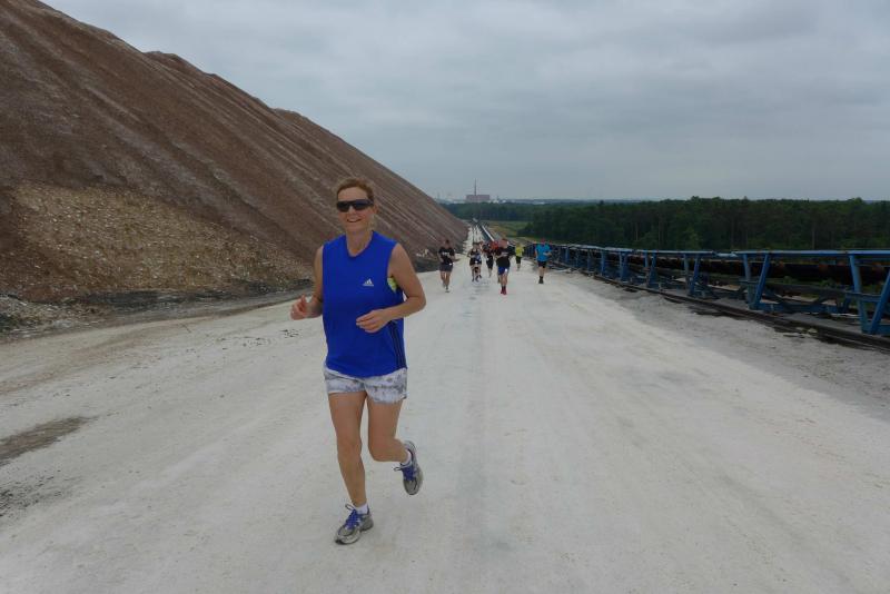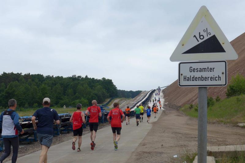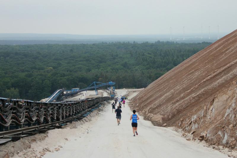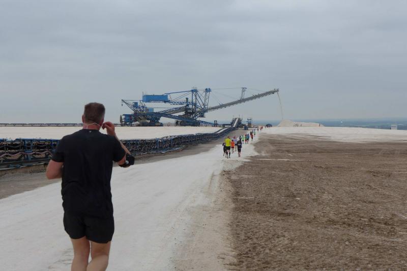 Am ersten Getränkestand noch einmal aufgetankt, lag er dann in seiner vollen Dimension vor den Läufern: Der berühmt, berüchtigte Kalimandscharo. Nun kam nicht nur für die Läufer der erste Anstieg - auch für das Förderband ging es bergauf. Der Weg auf dem hellen Abraummaterial blendete extrem. Verflixt, gab es doch beim Start bei bedecktem Himmel garkeinen Grund für den Einsatz von Sonnenbrillen.