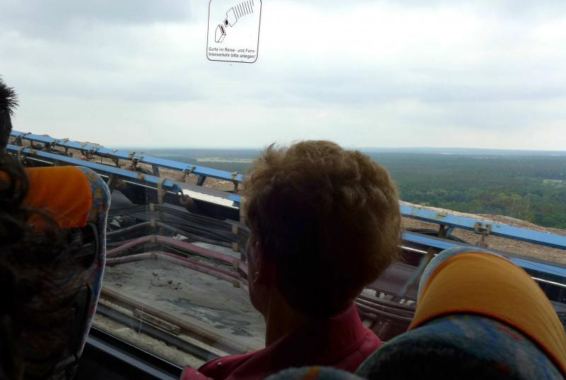 Nach 1,5 Kilometern und Steigungen bis zu 16 Prozent, war das Hochplateau auf 120 Metern erreicht. Das versprach Erholung und der frische Wind sorgte schnell für die nötige Abkühlung. In diesem Jahr war auf Grund der laufenden Produktion der Rundkurs über das Plateau nicht möglich. Damit fehlte leider der nördliche Blick in die weiten Elbauen. Stattdessen ging es immer schön dem Förderband folgend, bis hin zur riesigen Absetzanlage, welche den Abraum schließlich für die Ewigkeit platziert. Ein letztes Foto, ein letzter Ausblick, bevor es nach einer kurzen Schleife auf den gleichen Wegen rasant hinab ging.