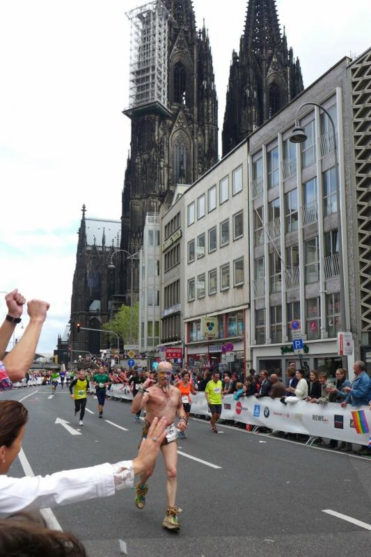 Unter den knapp 6000 Teilnehmern quälten sich auch Dirk Meier und Sabine Börner über die 42,195 Kilometer. Meier, der nach wie vor seinen Traum von 2:59 Stunden träumt, hatte sich entsprechend seinem Trainingszustand beim 3:15 Stunden Zeitläufer einsortiert. Mit angezogener Handbremse folgte er diesem Tempo bis Kilometer 35. Den Schmerz ausgeblendet, konnte er im letzten Drittel noch einen Gang zulegen. Börner hingegen schloss sich vorerst dem 4:00 Stunden Zeitläufer an. Aber bereits ab Kilometer neun musste sie abreißen lassen. Dies hatte sich schon bei den Tempoläufen im Training angekündigt. Als dann bei Kilometer 26 die Freunde an der Strecke standen, liefen erstmal dicke Kullertränen. „Bine, umkehren wäre jetzt aber auch blöd!“ Recht hatten sie und so weit hinten auf der Strecke offenbarte sich viel schlimmeres Elend. Vom hinkenden Läufer über krampfende Gestalten bis zum Totalausfall. Also dann lieber im Wohlfühltempo die Strecke genießen. Mit einem Stieleis in der Hand, reihte sich eine Läuferin wieder in den Trupp: "Sorry, ich muss mich hier irgendwie motivieren!" Gelächter in den Reihen, Applaus von den Zuschauern. Auf den letzten drei Kilometern durch die Kölner Innenstadt drängten sich die Zuschauer immer dichter und trugen die Aktiven förmlich in das Ziel. Der Dom war das Ziel, imposant empfing er alle Finisher.