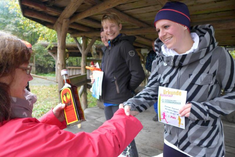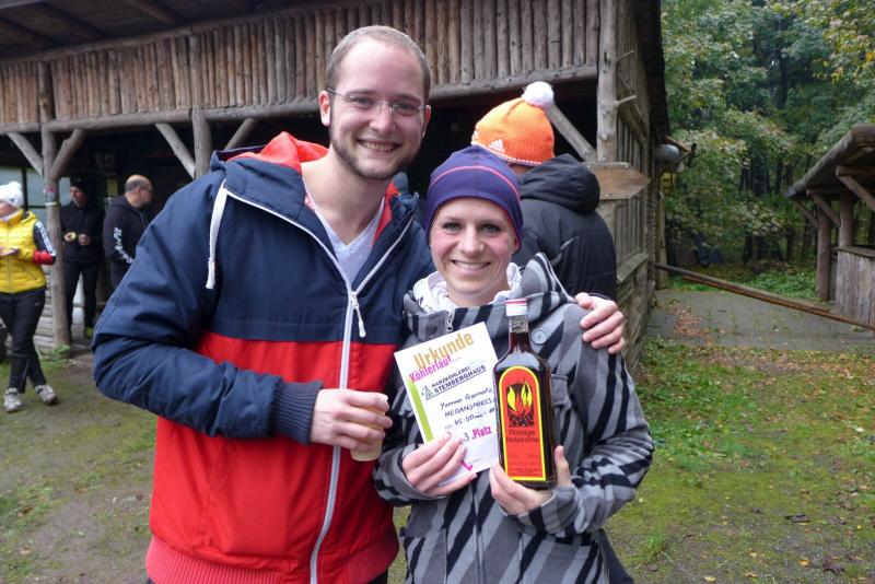 Dafür, dass die Börners gerne unbekannte Läufe testen um dann im nächsten Jahr vielleicht den Rest der Bode-Runners zu begeistern, sind sie verschrieben. Der Köhlerlauf, ausgetragen von der Harzköhlerei Stemberghaus, war mit seiner fünften Auflage noch nicht ganz den Kinderschuhen entwachsen. Der wunderschöne Rundkurs durch das Harzer Land, unweit von Pullman City und Rappbodetalsperre, hätte durchaus ein größeres Teilnehmerfeld verdient. Hier wurde zum Start mit dem Horn geblasen und wer am Ende zu den glücklichen Gewinnern gehörte, der erntete auch echt „Köhler-typische“ Produkte. So erlief sich die Gewinnerin über 10,5 Kilometer (Luisa Merkel, Nordischer Skiverein) gleich einen riesigen Sack Holzkohle für die nächste Grillsaison, während Yvonne Garnatz (Medansports Leipzig) die hochprozentige Holzkohle in verflüssigter Form überreicht bekam. Garnatz mit noch wenig Wettkampferfahrung, war zur Verstärkung der Gaensefurther aufgelaufen. Das schnelle Anfangstempo schockte, doch mit zunehmender Streckenlänge relativierte sich die Geschwindigkeit. Mit Lutz Schindler vom MSV Halberstadt fand sie dann das richtige Tempo, was sie bis zum Ziel halten konnte. Einstiger Bode-Runners Florian Börner rannte wie in alten Zeiten mit seinem Vater um die Wette. Aber das Rennen dauerte nicht lange an, hatte Börner Senior doch auch vom hinteren Streckenfeld noch Fotos zu machen. Nach dem Zieleinlauf waren sich alle einig: Ein weiterer schöner Harzlauf zum weitersagen…