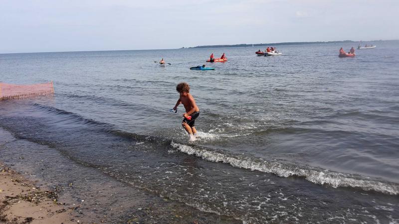 Finn startete auch zum ersten Mal im Freiwasser über 500 m. Annett schwitzte ganz schön, als beide in der Ostsee waren, aber das DLRG hatte die Veranstaltung super organisiert und abgesichert. Mit den Kindern wurde am Strand eine 10 minütige Erwärmung durchgeführt. Auch Finn hatte Spass und ließ sich von den Wellen nicht unterkriegen.