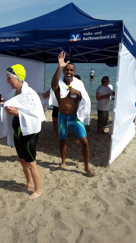 Da bei Lampes auch im Urlaub der Sport nicht zu kurz kommt, wagte sich Matthias 2 Wochen zuvor an einen Langstreckenschwimm-Wettkampf in der Ostsee, der von der Insel Poel bis nach Hohen Wieschendorf bei Wismar über 3,5 km ausgetragen wurde. Die Ostsee hatte 19 Grad und bei Langstreckenschwimmen darf nur in Badehose geschwommen werden. Der Gaensefurther Triathlet absolvierte die Strecke als 71. in 1:21:33 Std. Es war sein erster Wettkampf dieser Art in der Ostsee und wird laut seiner Aussage mit Sicherheit nicht sein letzter gewesen sein.