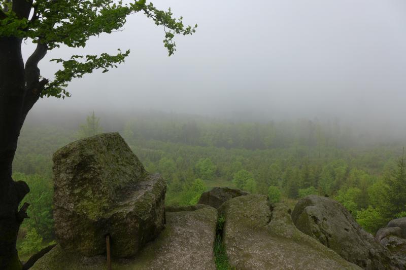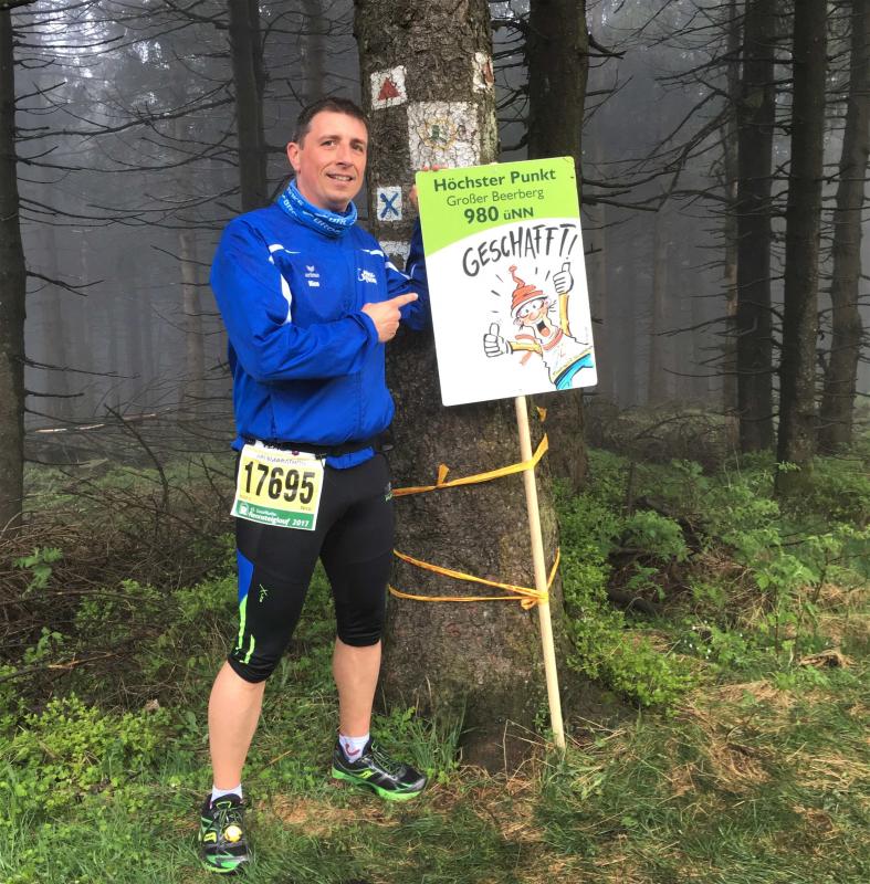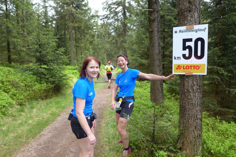 Mit "Hoher Schorn" auf 850 Metern war dann der dritthöchste Aussichtspunkt der Strecke erreicht. Schnell ein Foto mit Uwe vom Team Frankenwild, denn Uwe war an einem ganz anderen Punkt angekommen. Er wollte schlicht und ergreifend aufgeben, hatte genug gesehen vom Höhenweg des Thüringer Waldes, ihm tat einfach alles weh. Da hatte er aber die Rechnung ohne die Bode-Runners gemacht, die alles daran setzten, ihn wieder auf Trab zu bringen. Die Karawane zog weiter und euphorisch wurde das Kilometerschild „50“ gefeiert!
