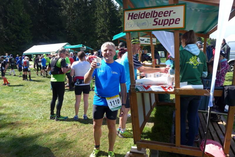 Der aufkommende Hunger wurde an der Verpflegungsstelle "Grenzwiese" traditionell mit Haferschleim besiegt. Es gab aber auch Stullen mit diversen Aufstrichen, Obst, Kuchen und natürlich ausreichend Wasser und warmen Tee. Die Männer aus den Reihen der Bode-Runners konnten der Versuchung nur schwer wiederstehen, war die Erinnerung an heftige Magenprobleme bei der 42. Auflage des Rennsteiglaufes doch noch nicht vergessen. Und überhaupt musste nun langsam Fahrt aufgenommen werden, galt es doch die damalige Zielzeit von 09:16 Stunden zu unterbieten.