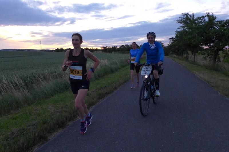 5:00 Uhr: Mit dem Startschuss der Staffelläufer legte sich dann auch die Aufregung. Als Erwärmung durften die ersten vier Kilometer im flachen Terrain absolviert werden, die beeindruckenden Berge grüßten bereits aus der Ferne. Ruhig rollten die Räder neben den Läufern über Asphalt und mit Laucha war auch bald die A4 unterquert. „Dreh dich mal!“, ordnete Jens-Uwe an und sogleich zauberte der Sonnenaufgang ein breites Grinsen in Sabines Gesicht. „Hast du Juliane noch gesehen?“ erkundigte sie sich nach den Gefährtinnen. „Ja, aber das Affentempo mach ich nicht mit!“, nimmt Sabine zufrieden zur Kenntnis.