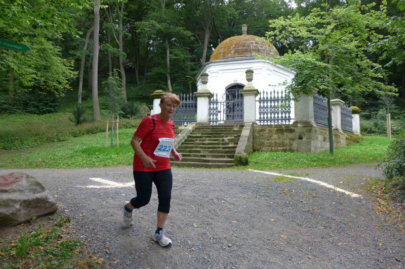 Für die Jugend, die Frauen und für alle Männer ab der Altersklasse M70 war die Sechs-Kilometer-Distanz vorgesehen, die jüngeren Männer durften inklusive Treppenaufstieg ganze 13 Kilometer zurücklegen. Vorbei an Spiegels Mausoleum mit seiner Rundkuppel, ging es hinauf und hinab durch den historischen Landschaftspark der Spiegelsberge. Bald trennten sich die Strecken und während sich die Kurzdistanz nach einer scharfen Linkskurve auf den Rückweg machte, genoss der lange Kanten zunächst die Aussicht auf den Brockengipfel.