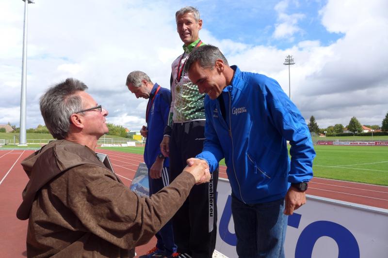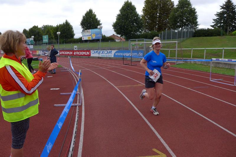 Spätestens am Treppenaufstieg über 63 Höhenmeter war der Genuss dann vorbei. Doch der Mönch belohnte die Anstrengungen mit reichlich kühlem Nass und anspornenden Worten, so dass nach kurzem Luftholen die Beine auch wieder laufen wollten. Bald war der höchste Streckenpunkt erreicht und es ging auf weichem Waldboden und auf reichlich Kienäpfeln wieder hinab. Jens-Uwe Börner, der verletzungsbedingt wandernd auf der Sechs-Kilometer-Distanz unterwegs war, freute sich, dass jeder Läufer der Langdistanz auf dem Weg zum Ziel an ihm vorbei musste. Die Actionfotos waren schnell im Kasten und einen aufmunternden Spruch gab es natürlich auch mit auf den Weg. Mit dem Schwung aus den Bergen ging es rasant in Richtung Stadion. Die Sprecherin war bereits zu hören und die letzten Meter auf der Tartanbahn waren viel zu schnell vorbei. Halberstadt, das war wieder wunderschön - ja schön war’s…