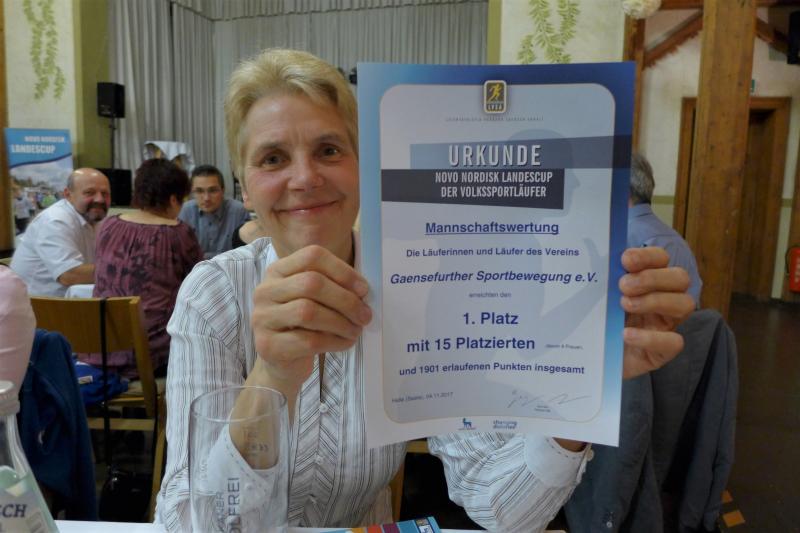 Im Gepäck hatte Kley jedoch nicht nur die sympathische Anekdote über die unfreiwillige Erkundung des Salzlandkreises, sondern auch reichlich Lob. Zuallererst für die LVSA-Fachkommision Lauf, die neben Broska auch Bernd Ebert, Sven Projahn, Martin Springer und Helmut Zausch einschließt. „Gemeinsam haben wir nach einem neuen Konzept gesucht, um attraktivere Läufe und eine bessere Wertung für den Cup zu finden.“ Der Blick in den Saal bescheinigte dem Unterfangen Gelingen: „Dass es funktioniert hat, wieder derart viele Teilnehmer anzuziehen, ist ein Ansporn, künftig noch mehr Läufer zu gewinnen.“ Um die Gewinner – namentlich alle 121 Qualifizierten in der diesjährigen Wertung – ging es schließlich am Sonnabend in erster Linie. Kley würdigte: „Der Novo Nordisk-Landescup ist das Highlight unseres Verbandes. Es ist eine Wertung, die etwas bedeutet. Nämlich dass man sich engagiert und gekämpft und seine Leistung über einen längeren Zeitraum nachgewiesen hat.“ Dies taten in diesem Jahr vor allem die Bode-Runners der Gaensefurther Sportbewegung. Zwar kamen von 21 Athleten, die an einer der zehn Cup-Stationen teilnahmen, nicht alle auf die erforderlichen vier Wertungsläufe, doch jene 15, die es taten, bescherten dem Staßfurter Verein den Gesamtsieg in der Mannschaftswertung. Insgesamt 1901 Landescup-Punkte nach Einzelstartern „sind schon der Wahnsinn“, befand Bernd Ebert, der in Barby durch den Ehrungsteil führte.