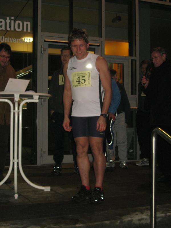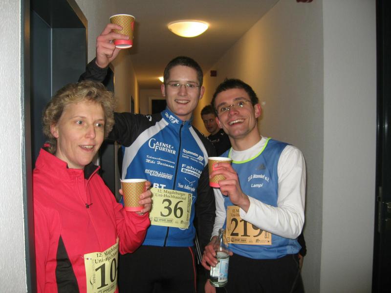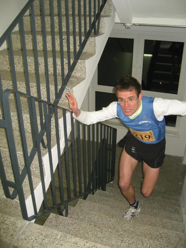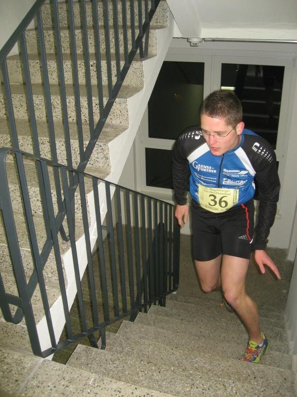 Jeder Sportler startet nach Eingabe seiner Startnummer in den PC für sich allein. „Fünf, vier, drei, zwei, eins - los!“ Die Entertaste bestätigt, Florian Börner mit der Startnummer 36 ist unterwegs. Nun beginnt der Wettlauf gegen die Uhr. Seit 2002 liegt der Streckenrekord über 232 Stufen bis in die 14. Etage bei 57,8 Sekunden. Nach 60 Metern Anlauf kommen die ersten acht Stufen vor dem Eingang in den Campus-Tower. Im Uhrzeigersinn geht es nun von Etage zu Etage, immer möglichst drei Stufen mit einmal. Weit am Geländer nach oben gegriffen, zieht sich Florian auf die nächste Treppe. In großen Ziffern steht die Geschosszahl an den Etagenausgängen. „Nur nicht hinsehen, jetzt noch nicht!“ Es läuft gut, die Kräfte richtig einteilen und tief Luft holen. Die Beine werden schwerer, aber mit der linken Hand auf dem Oberschenkel nachdrücken, das hilft beim Schwung holen. Die elfte Etage ist erreicht, die Lunge brennt von den tiefen Atemzügen aber die Beine spielen noch mit. Endlich kommt die 14, also noch 16 Stufen bis zum Ausgang. Ein kurzer Flur noch bis zur Ziellinie und alles life im Internet: „Guten Abend Magdeburg!“ Geschafft versinken die ankommenden Läufer im engen Flur vor der Fahrstuhltür. Sanitäter begutachten die nach Luft schnappenden Sportler und reichen Getränke. Florian Börner vom cash´n fun Junior Team der Salzlandsparkasse benötigte 64 Sekunden für seinen Hochhaustrip, am Ende ein glücklicher Platz in der Top-Ten-Wertung. Vater Jens-Uwe Börner, welcher etwas mehr Winterspeck in die 14. Etage schleppen musste, beendete als 79. diesen Lauf. Zum ersten Mal dabei, absolvierte Christoph Lampe von der ZLG Atzendorf tief beeindruckt und fasziniert, sein Debüt auf Platz 95. Bei den Frauen ein starkes Teilnehmerfeld. 19 Mädels waren bereits beim Kinderlauf gestartet, 34 Damen folgten nun beim Hauptlauf. Von den Bode-Runners der Gaensefurther Sportbewegung kam Annegret Wille am schnellsten nach oben (2. Pl. Altersklasse ab 35). Dicht gefolgt von Andrea Krukowski (3. Pl. AK ab 35) und Sabine Börner. Oben angekommen vermisste man in diesem Jahr die frische Luft und die tolle Aussicht auf das nächtliche Magdeburg, welche das kleine Flurfenster einfach nicht hergab. „Nun gut, aber runter nehmen wir jetzt den Fahrstuhl!“