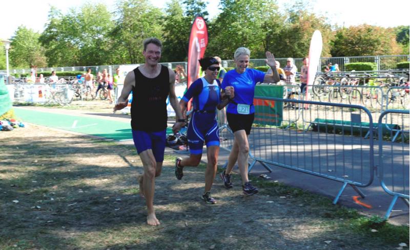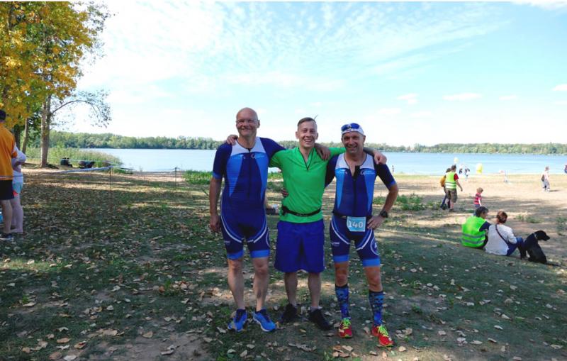 Teamtriathlon bedeutet, dass jeder der drei Triathleten zunächst 750m Schwimmen muss, dann steigt jeder nacheinander 22km auf das Rad und abschließend absolvieren alle drei 5km laufend um den Barleber See.