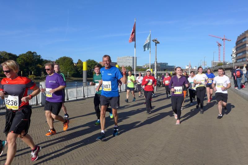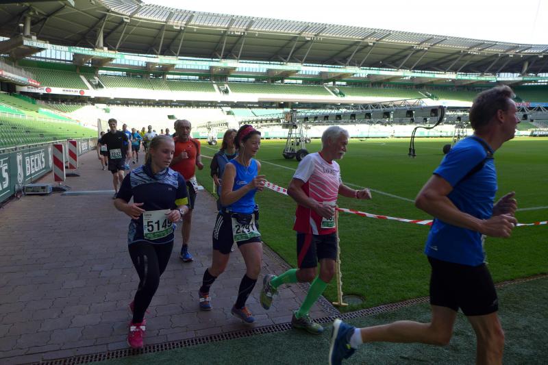 Mitten auf dem Marktplatz, zwischen Dom, Stadtmusikanten und dem Bremer Roland, erfolgte dann der Start über die Marathondistanz. Die Bode-Runners der Gaensefurther Sportbewegung hatten mit Kirsten Geist nur eine Teilnehmerin über die Königsdisziplin am Start. Mit allen guten Wünschen der Vereinskollegen machte sie sich zusammen mit 900 weiteren Startern auf den 42,195 Kilometer langen Weg. Es sollte nicht viel Zeit vergehen, dann wurden auch die Zehn-Kilometer-Läufer auf die Reise geschickt. Bei immer noch kühlen Temperaturen aber herrlichem Sonnenschein, finishte Christa Fümel aus Egeln ihren Lauf in neuer persönlicher Bestzeit. Noch deutlich unter einer Stunde, war sie außer sich vor Freude. Diese Euphorie nahmen die noch wartenden Gaensefurther gerne mit auf ihre Halbmarathondistanz. Die fast 3.500 Teilnehmer sollten an diesem Sonntag die letzte und größte Startgruppe sein und am Ende mit den meisten Marathonstartern im Ziel ankommen. Auf der gesamten Strecke durch die City feierten die Bremer begeistert ihre 14. Auflage des immer beliebter werdenden Stadtlaufes. Während die Teilnehmer auf der langen Distanz neben dem Rhododendron- und Bürgerpark auch den Badestrand am Werdersee und das Weserwehr zu Gesicht bekamen, begnügte sich der „Halbe“ mit der Überseestadt, der „Schlachte“ des einstigen Hafens und führte an der berühmten Böttchergasse und dem Schnoor Viertel mit seinen urigen Kneipen und Häuserzeilen vorbei. Direkt an der Weser entlang, kam das gigantische Stadion des viermaligen Deutschen Fußballmeisters dann endlich immer näher. Der Stadionsprecher hatte bei den vielen Teilnehmern seine Mühe, jeden Durchläufer namentlich zu erwähnen. Nach einer halben Stadionrunde war das Spektakel dann auch schon vorbei und nach einem kleinen Anstieg hinauf auf den Osterdeich, führten die letzten drei Kilometer durch die Stadt dann Richtung Ziel. Gruppen wie „Lustvolllaufenlernen“, die Renn-Enten, das Team Eggi, Laufrausch oder die Turnerschaft Harburg, alle hatten sich auf diesen Moment vorbereitet, alle wurden euphorisch auf dem Marktplatz empfangen und so für das lange Training belohnt. Auch bei den Gaensefurthern hagelte es Bestzeiten, denn neben André Geist, der noch nie so schnell auf der Halbmarathondistanz war, konnte auch Ehefrau Kirsten ihre bisherigen Marathonzeiten toppen. Im Hause Fümel werden sicher die Sektkorken geflogen sein, denn auch Harald konnte an seinem Ziel, unter zwei Stunden zu bleiben, endlich ein Häkchen setzen.