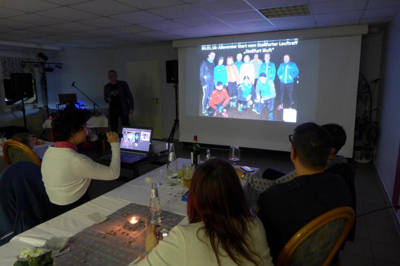 Als Veranstaltungsort wurde das Sportcentrum in Gaensefurth ausgewählt. Eine große Anzahl von Läufern, zum Teil mit Partnern oder auch einigen Kindern, machten sich auf den Weg dorthin. Angenehm überrascht waren alle von der geeigneten Räumlichkeit und dem schmackhaft und abwechslungsreich gestaltetem Büfett. Selbst für die musikalische Begleitung war durch einen Lauffreund aus Bernburg bestens gesorgt. Nach einer ausgiebigen Begrüßung, die durch neue Mitglieder und Gelegenheitsläufer etwas länger ausfiel, blieben bei der Erstürmung des Büfetts keine Wünsche offen. Für ein besonders herzliches "Hallo" sorgte Teammitglied Sylvia Köhn, die sich trotz des nahen Geburtstermins ihres Nachwuchses zeitweilig unter die lustige Gesellschaft mischte. Als sie mit allen guten Wünschen von ihren Lauffreunden verabschiedet wurde ahnte niemand, dass sie schon wenige Stunden später ihren kleinen Fabian in den Händen halten würde. Ein Highlight war auch wieder der liebevoll und aufwendig gestaltete Jahresrückblick in Bildern von Sabine und Jens-Uwe Börner. Er sorgte für manch heiteren Kommentar und heizte die Stimmung an, die sich danach auf der Tanzfläche weiter entfaltete. Natürlich gehörten auch viele nette Gespräche zur positiven Bilanz des Abends.