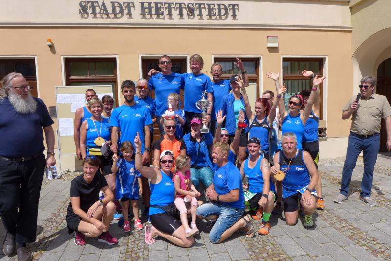 Über die Halbmarathondistanz bei den Männern blieb der Pokal in Hettstedt. Mario Brand siegte in 1:25:16 Stunden, Dirk Meier sicherte sich Platz zwei in der Gesamtwertung vor Vereinskamerad Steffen Schöler, der auch sicher noch die olympische Triathlondistanz vom Vortag in den Beinen hatte. Einzige Gaensefurther Teilnehmerin die sich dreimal über den Jägerberg quälte, war Kirsten Geist. Sehnlichst von den Runners auf dem Markplatz erwartet, lief sie auf Gesamtplatz zwei ein.