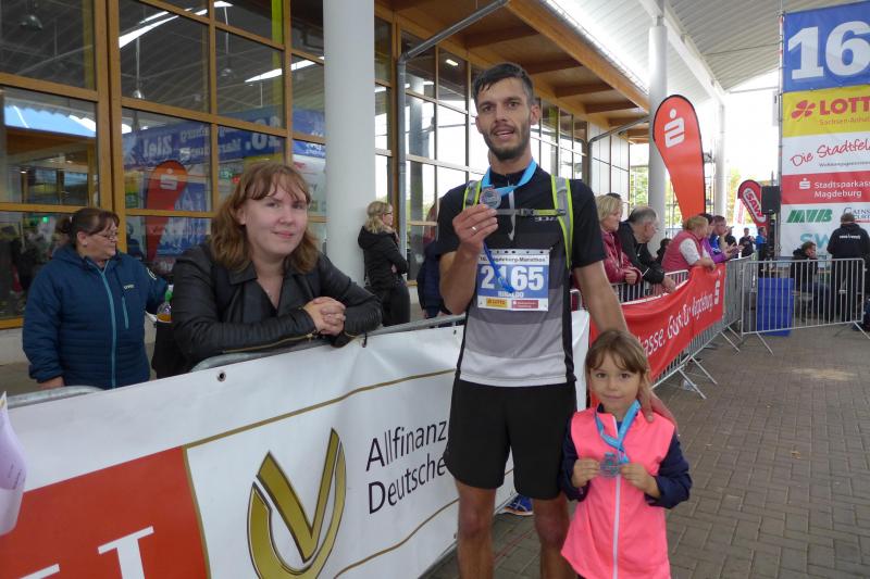 Allesamt wieder vereint, ging es dann für die Bode-Runners beim Magdeburg Marathon an den Start. Während dieses Highlight in der nahen Landeshauptstadt viele Läufer noch als Saisonabschluss mitnahmen, war Rinaldo Schielke auf den Tag genau fit. Viele Wettkämpfe in den letzten Wochen galten allein der Vorbereitung auf die Marathondistanz über ganze 42,195 Kilometer. Zielzeit 03:30 Stunden, so der Plan. Als Töchterchen Lenya beim Elbe-Biber-Kinderlauf die 400 Meter lief, hatte der Papa schon drei Kilometer in den Beinen, denn die Marathonis waren die ersten Starter ein diesem Tag. „Wir kommen dann gegen zwölf Uhr wieder!“, verabschiedete sich die Familie in den nahgelegenen Elbauenpark. In der Zwischenzeit absolvierten auch die Mini-Marathonis ihre 4,2 Kilometer, eine Handvoll Bode-Runners war auf zehn Kilometern unterwegs und Zaschke, Börner, Wuwer wie auch Bothe, finishten erneut einen Halbmarathon. Schnellster Gaensefurther war Matthias Lampe auf dieser Distanz, auch Petra Becker folgte fix. Mit dem einzigen Podestplatz für die Staßfurter Laufgruppe beendete Kirsten Geist ihren Zieleinlauf. In ihrer Altersklasse W50 lief sie stolz auf Platz zwei, im Gesamtklassement fand man sie als 22. Frau von 292 Starterinnen über 21,1 Kilometer in den Ergebnislisten. Und Schielke? Familie und Runners standen zur richtigen Zeit am richtigen Ort und der einzige Marathonläufer unter den Bode-Runners hatte sich tatsächlich gut an seinen Zeitplan gehalten! Nach 03:26:28 Stunden stoppte der Finisher seine Laufuhr – perfekt, Zielzeit gut und sicher erreicht! Nachdem Schielke alle Gratulationen der Lauffreunde entgegen genommen hatte und die Erstversorgung mit einem isotonischen Getränk auch wieder die Lebensgeister zurück holte, murmelte da jemand: „Na eine Zeit von 02:59:59 Stunden wäre natürlich auch ein Ziel!“