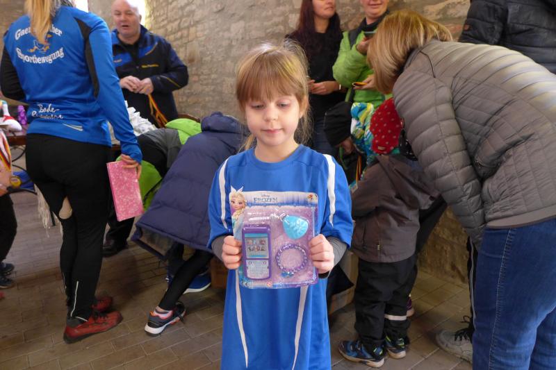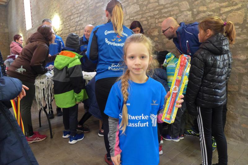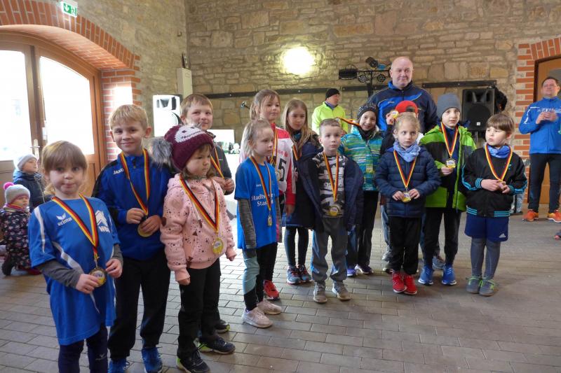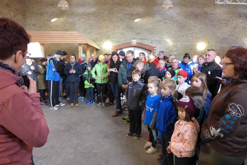 Das ließ er sich nicht nehmen! Der Aderstedter Bürgermeister Mike Franzelius bestand vor dem Start des Neujahrlaufes auf „sein“ Gruppenbild mit allen Teilnehmern. Den Wunsch erfüllten die 79 Starter natürlich gerne und reihten sich vor der Festscheune diszipliniert auf. Ungeachtet aller Vorbereitungen die so eine Laufveranstaltung mit sich bringt, hatte Franzelius bereits die fünfminütige Erwärmung gestemmt und die Ungeduldigen somit auf Betriebstemperatur gebracht. Bei angenehmen Lauftemperaturen standen dann alle Starter über eins und sechs Kilometer zappelig an der Startlinie. „Die Kinder laufen ihren Kilometer links, dann links und nochmal links!“, so der Bürgermeister, der sich auch für den erlösenden Startschuss bereitgestellt hatte. Los ging es, und noch mit den gesprochenen Worten im Ohr, liefen die Knirpse nach dem zweiten Links auch gleich das dritte Links, ohne den weisenden Streckenposten je gesehen zu haben und kürzten somit die Runde ab. Nur zwei Insider liefen wirklich einen Kilometer und kamen etwas verdutzt und ohne Verfolger ins Ziel. Die Aufregung war aber schnell vergessen, denn am Ende gab es für alle Kinder nicht nur eine Medaille, auch ein kleines Präsent durfte jeder mit nach Hause nehmen.